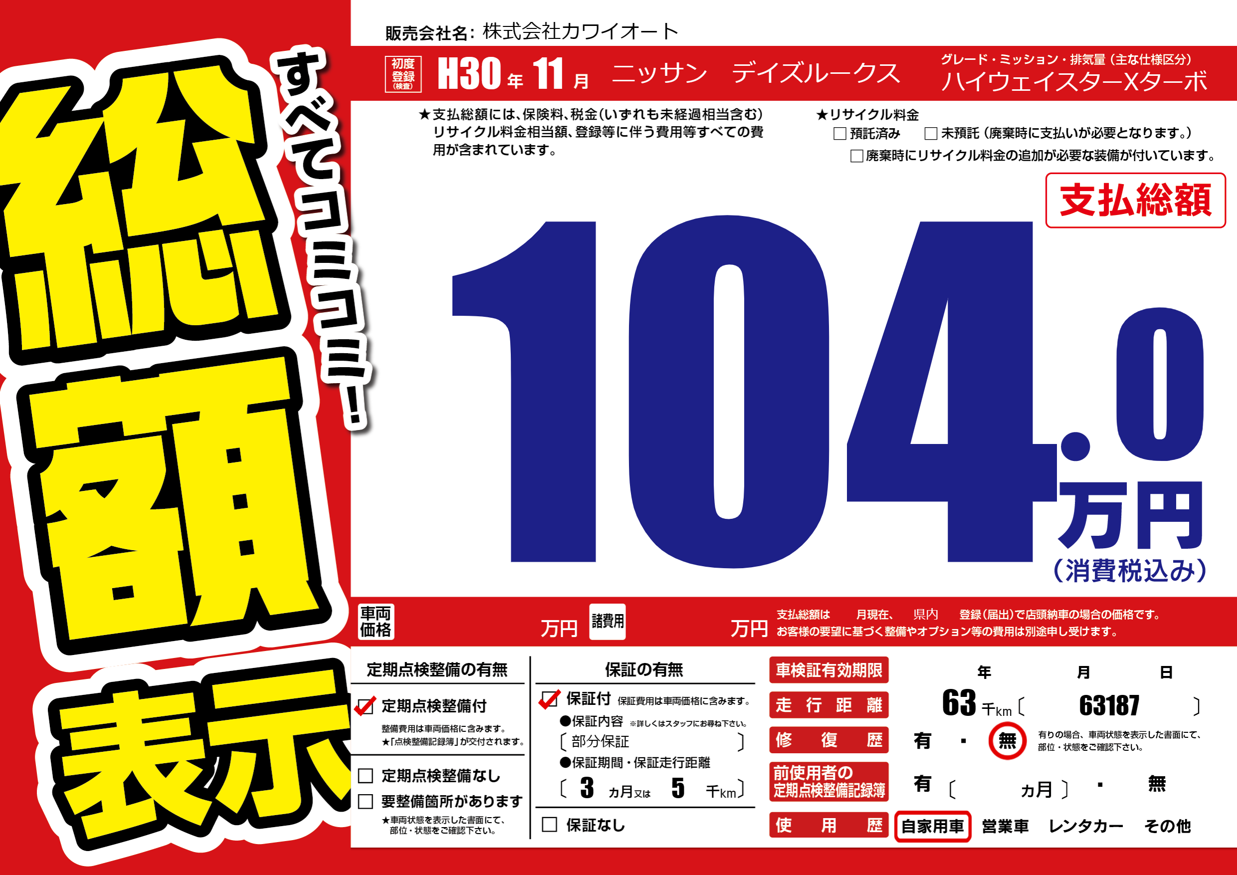 | 車名 | ニッサン デイズルークス | グレード ミッション 排気量 |