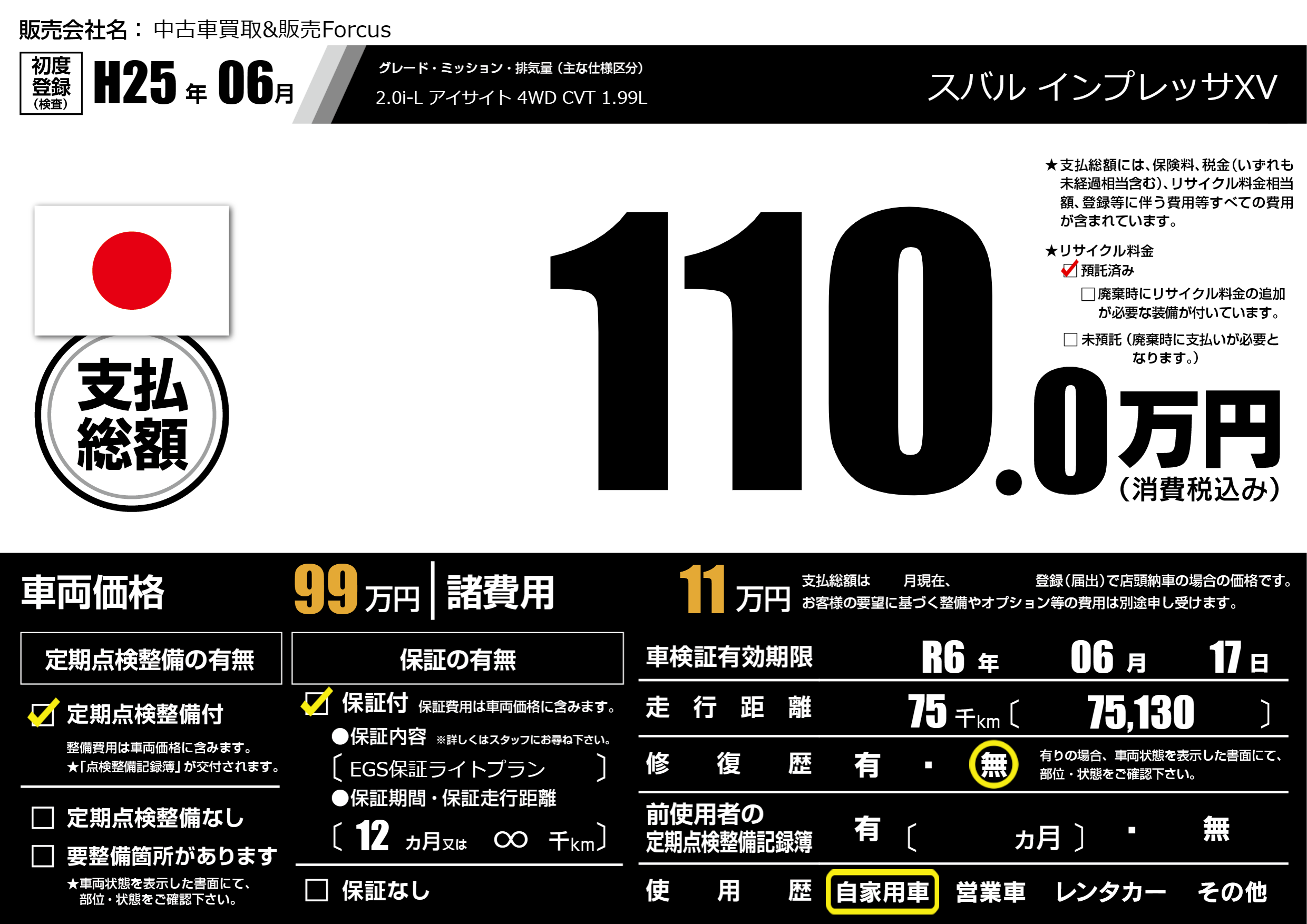 | 車名 | スバル インプレッサXV | グレード ミッション 排気量 |