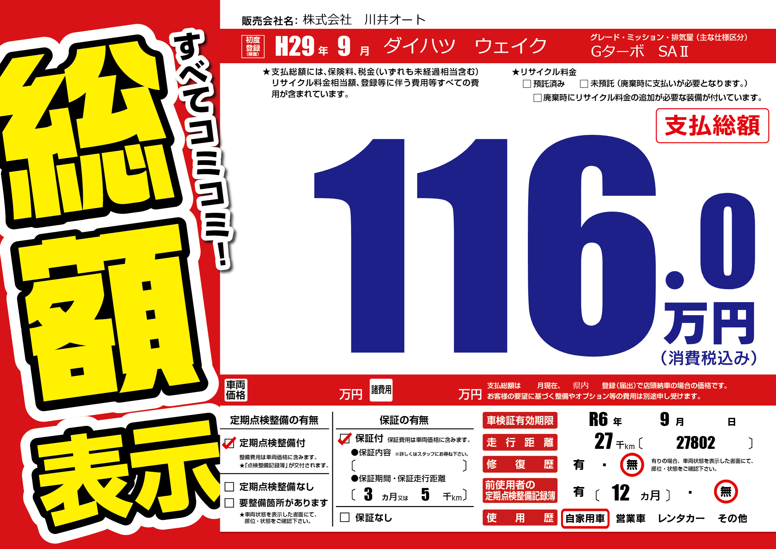| 車名 | ダイハツ ウェイク | グレード ミッション 排気量 |