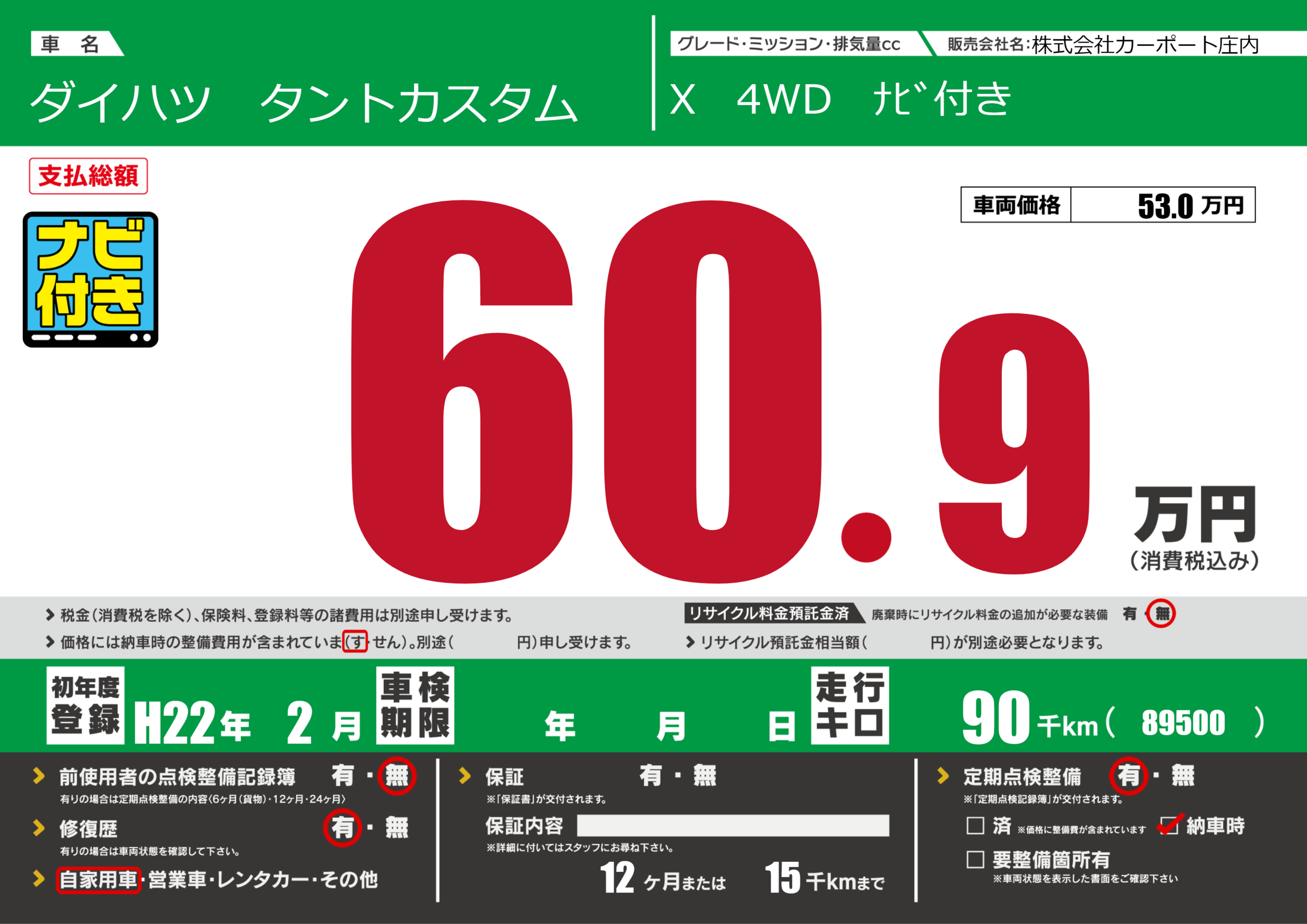 | 定期点検整備 | 定期点検整備あり 納車時あり | ||