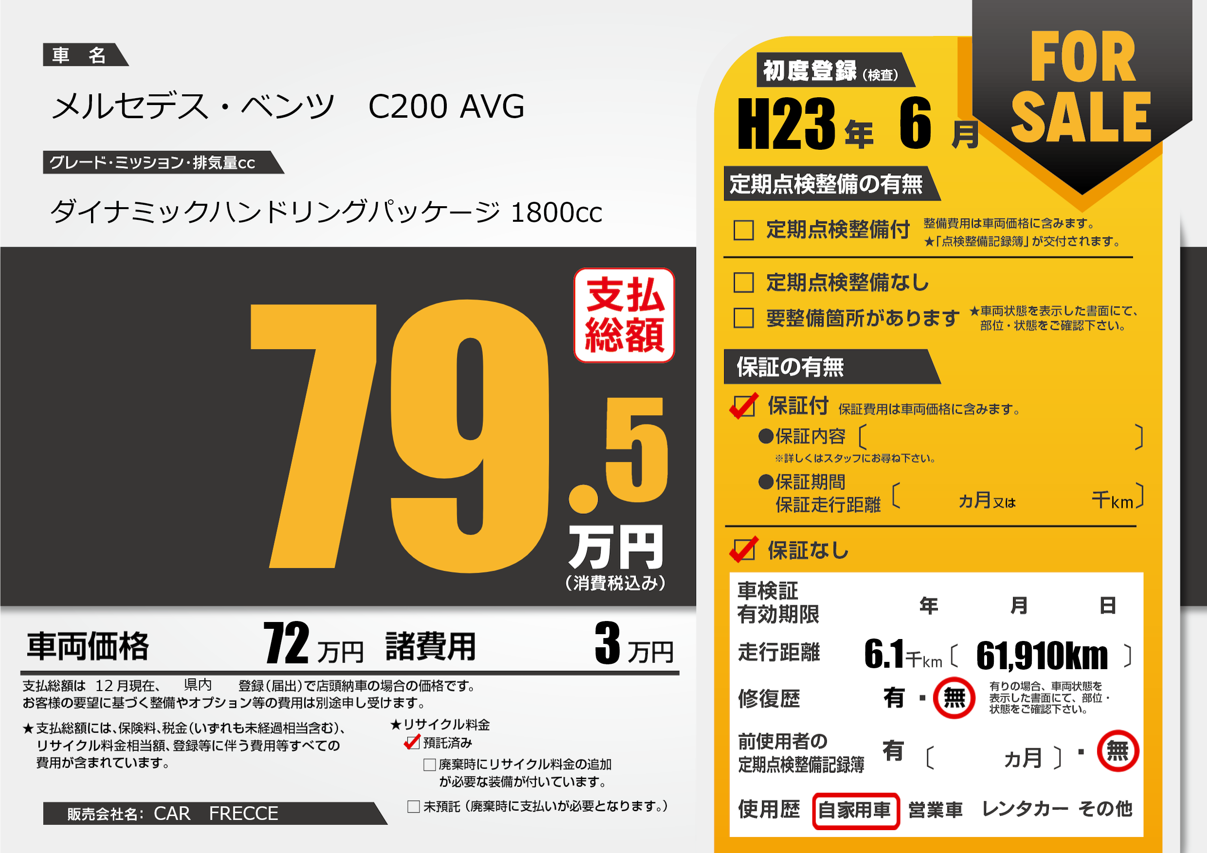 | 車名 | メルセデス・ベンツ C200 AVG | グレード ミッション 排気量 |