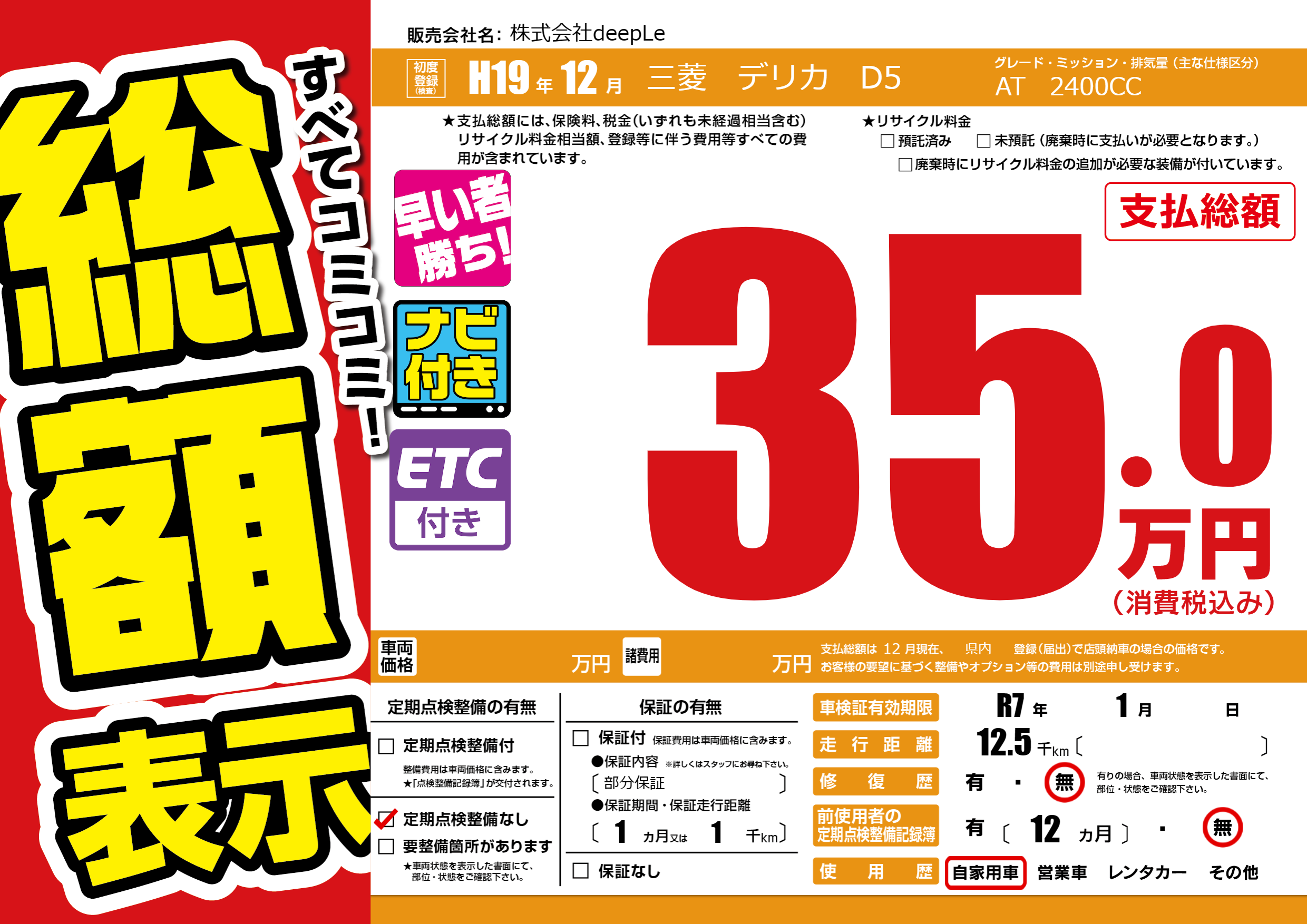 | 車名 | 三菱 デリカ D5 | グレード ミッション 排気量 |
