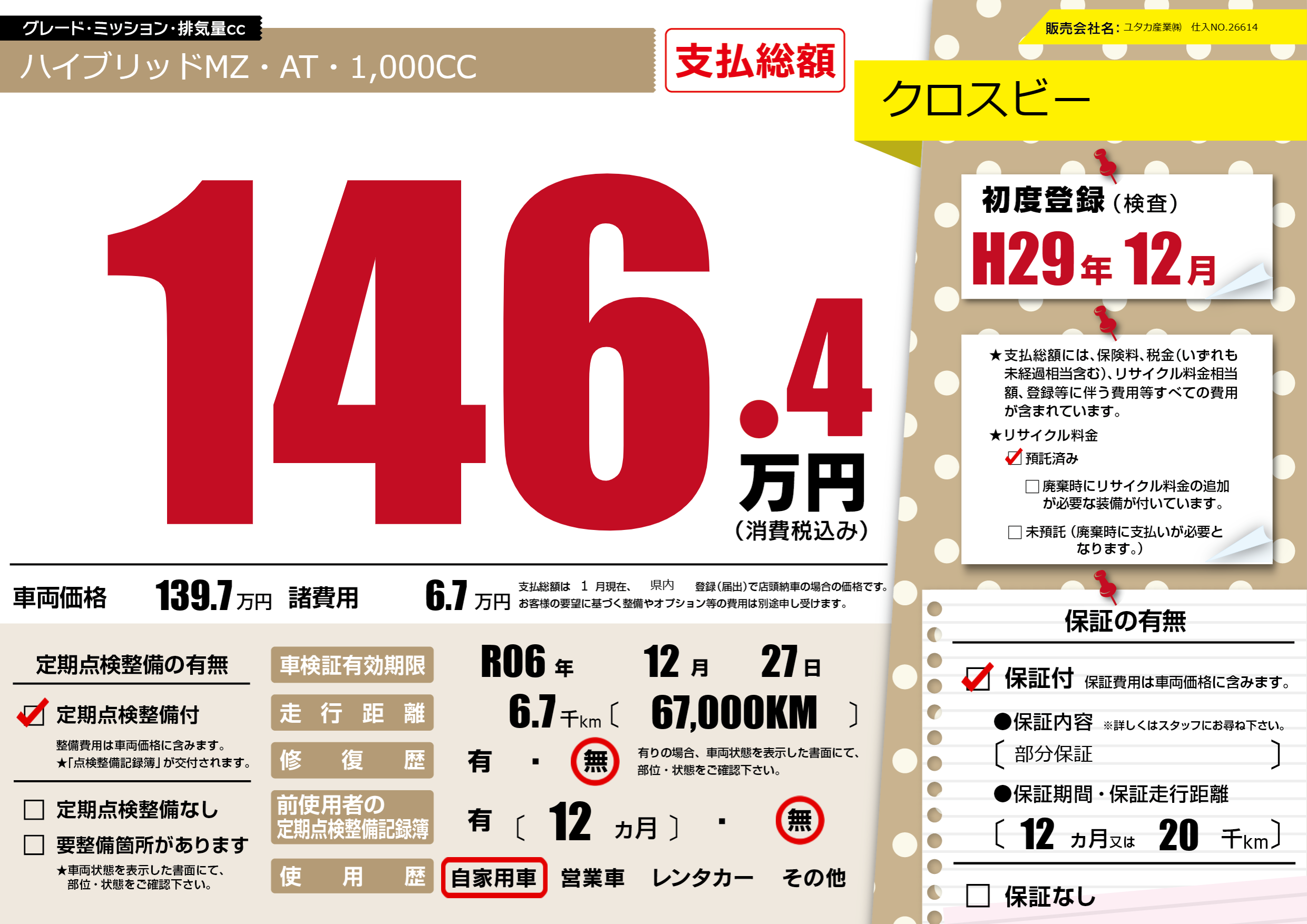 保証付き 保証内容(部分保証) 12ヶ月または(20)千kmまで |