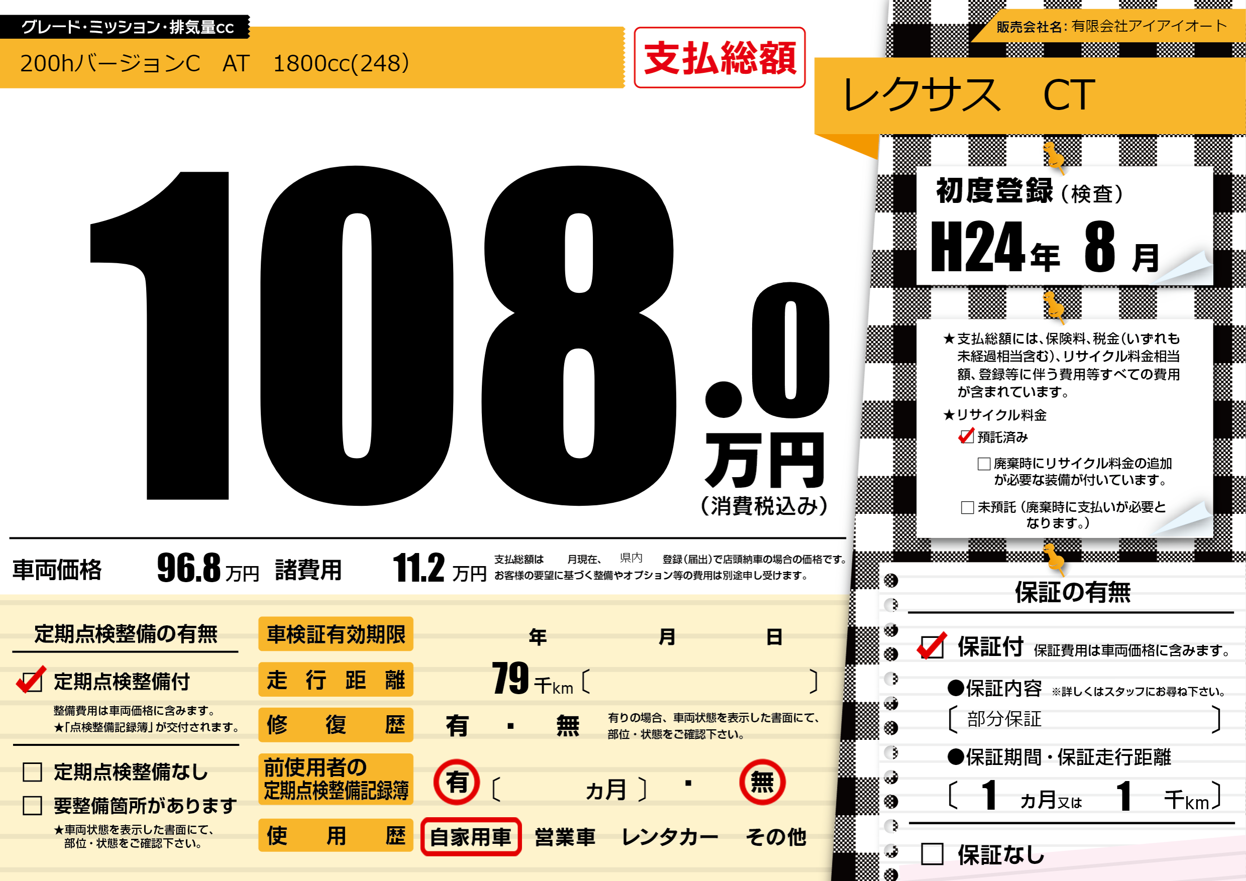 | 車名 | レクサス CT | グレード ミッション 排気量 |