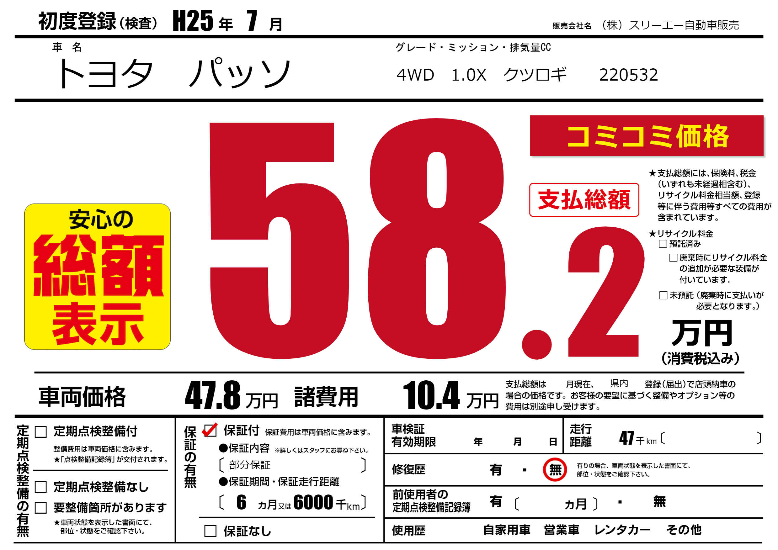 | 車名 | トヨタ パッソ | グレード ミッション 排気量 |