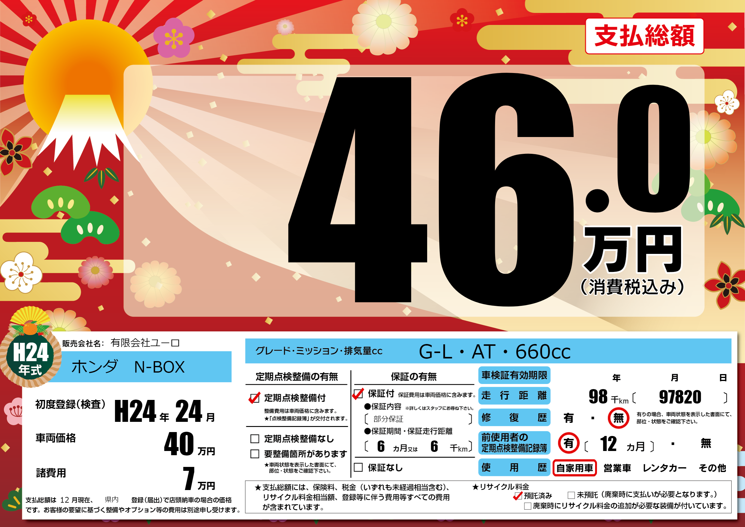 | 走行キロ | 9.8万km | 初年度登録 | H24年24月 |