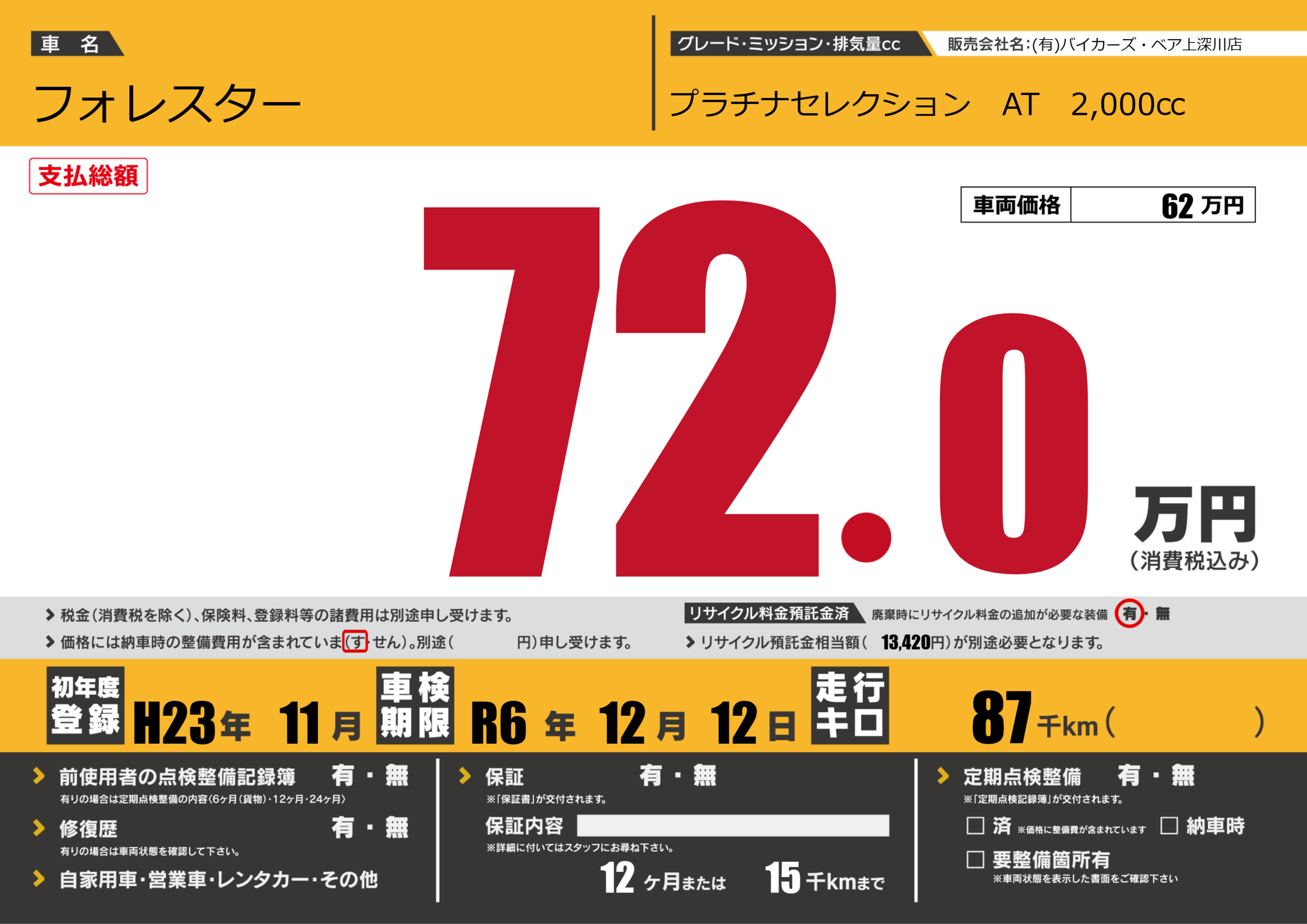 | 車名 | フォレスター | グレード ミッション 排気量 |