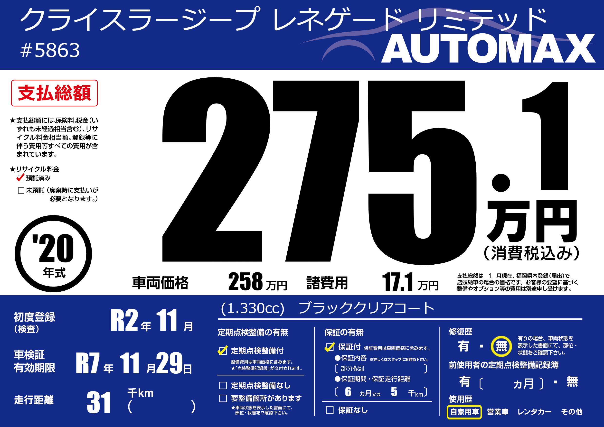 | 走行キロ | 3.1万km | 初年度登録 | R2年11月 |