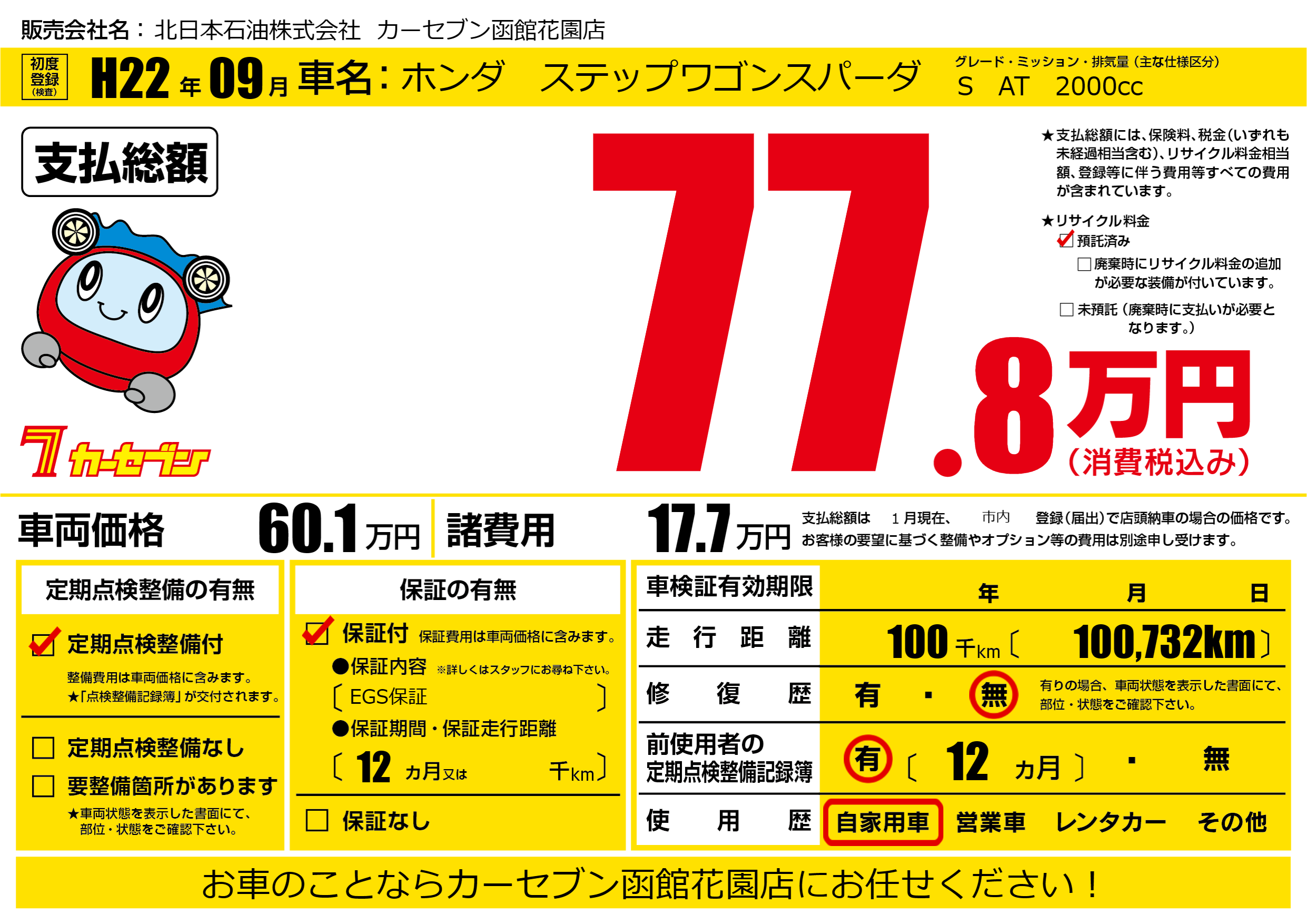 | 走行キロ | 10万km | 初年度登録 | H22年09月 |