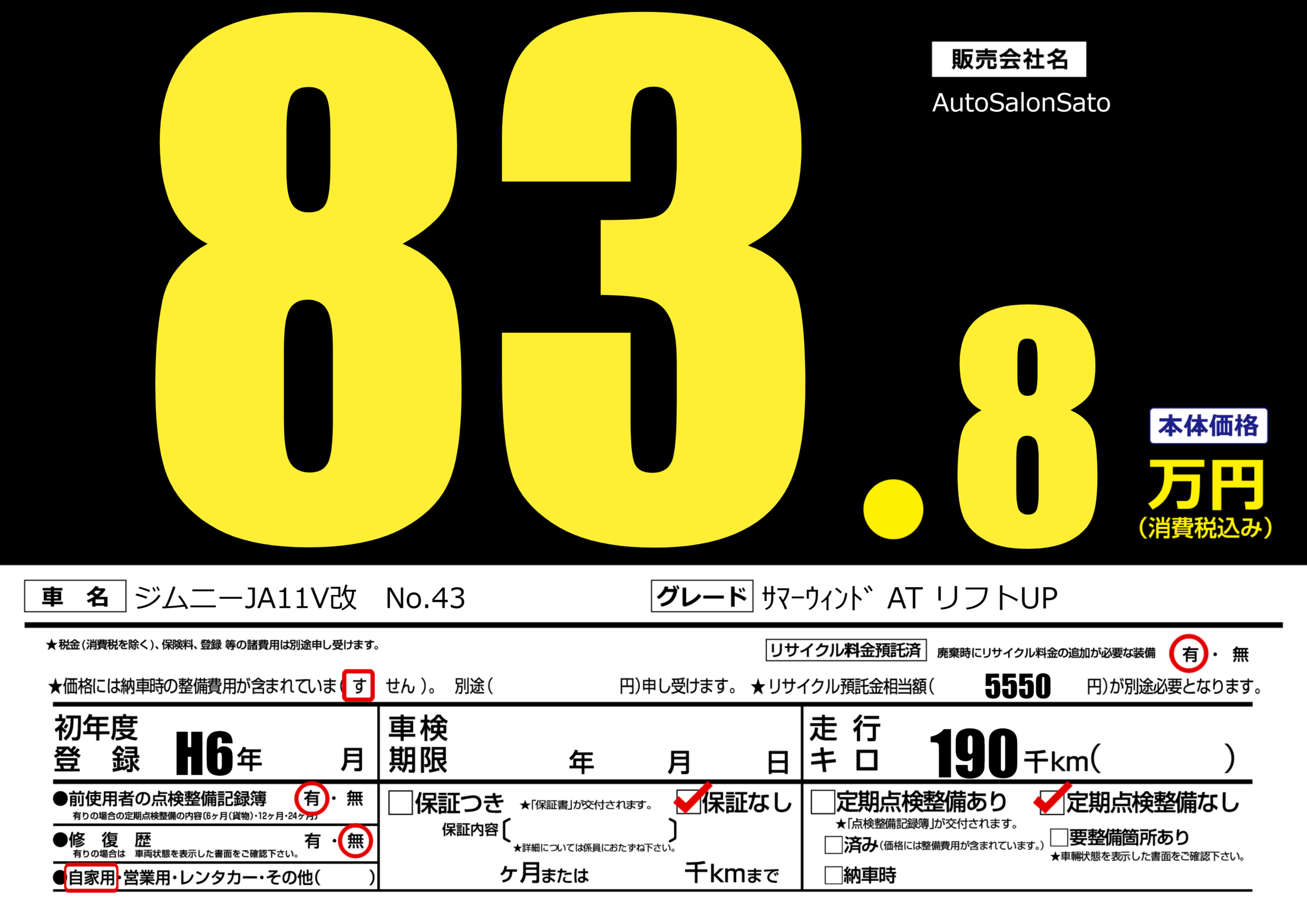 | 車名 | ジムニーJA11V改 No.43 | グレード ミッション 排気量 |