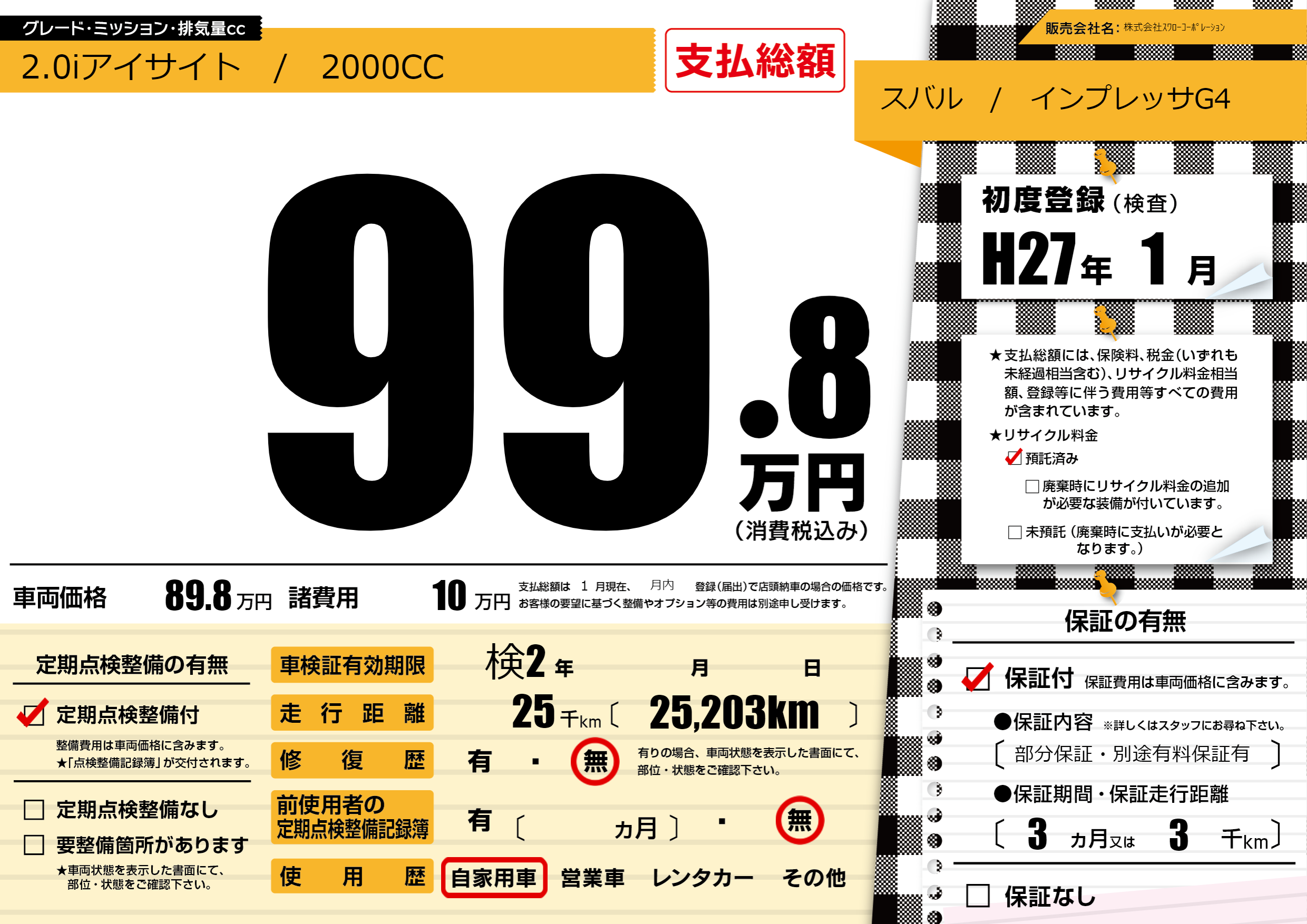 | 車名 | スバル / インプレッサG4 | グレード ミッション 排気量 |