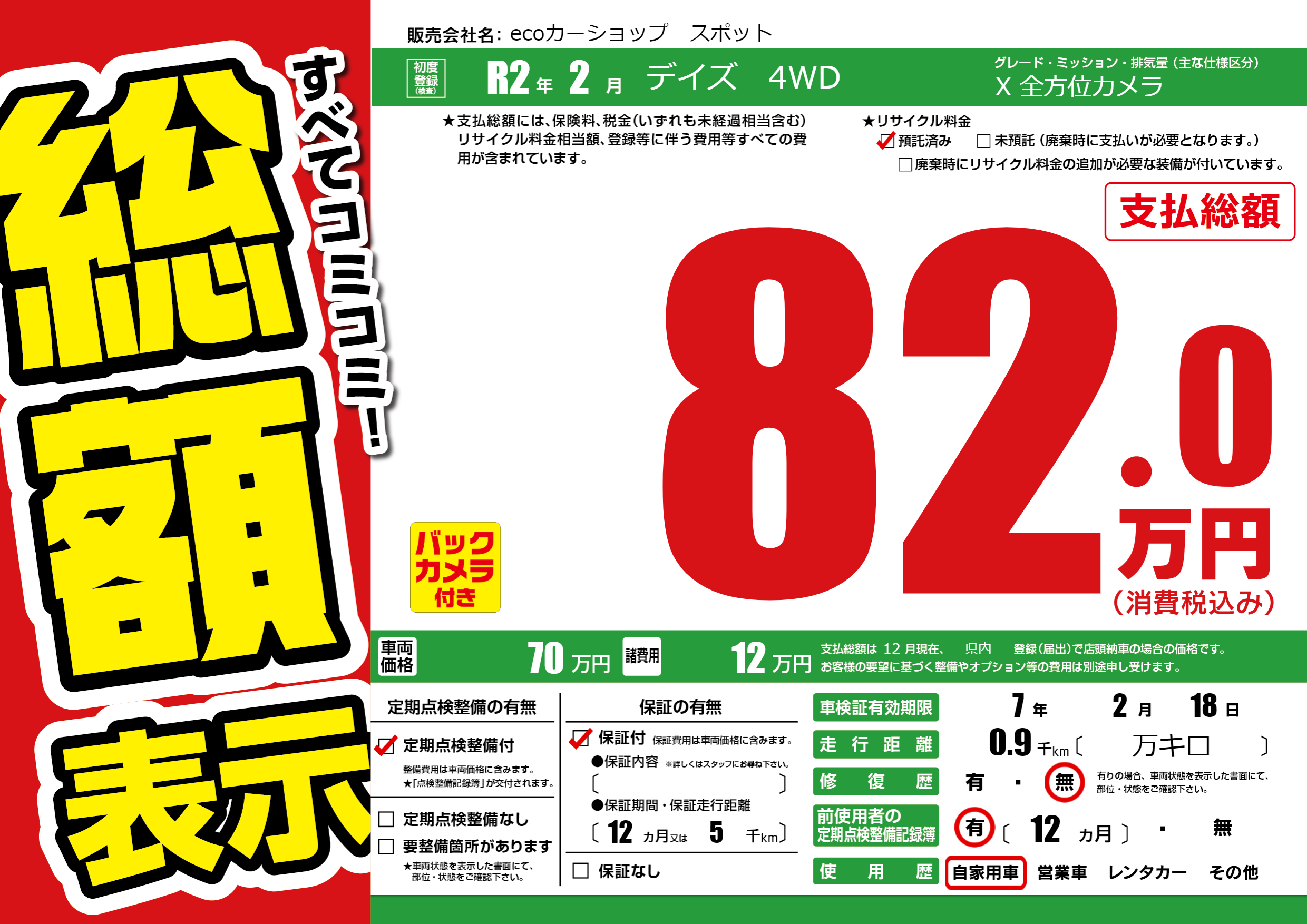 | 車名 | デイズ 4WD | グレード ミッション 排気量 |