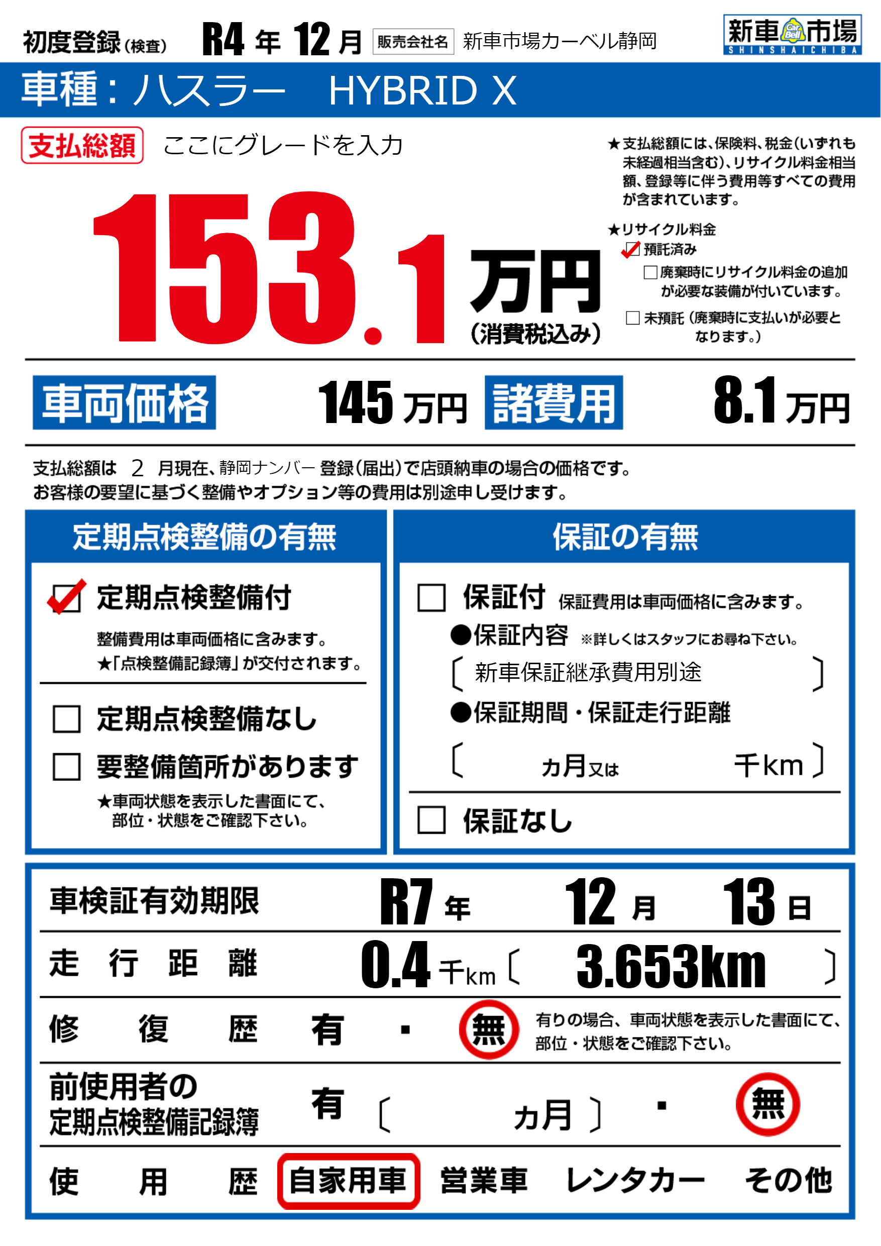 保証なし 保証内容(新車保証継承費用別途) ---ヶ月または()千kmまで |