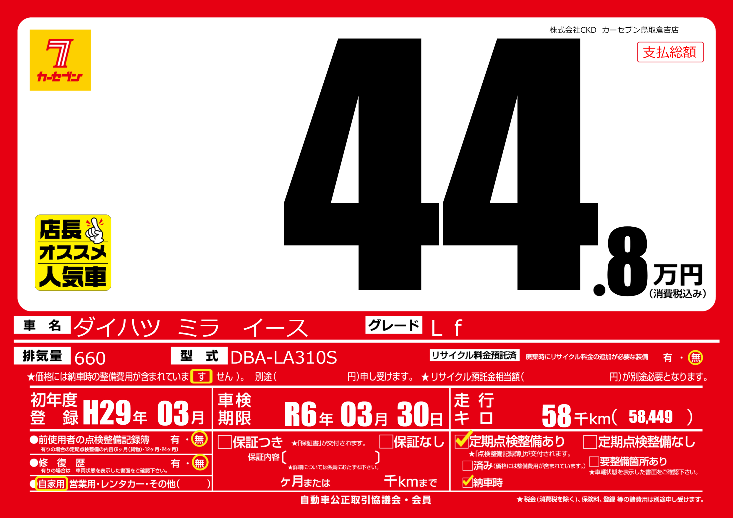 | 車検制限 | R6年 03月 30日 | ||