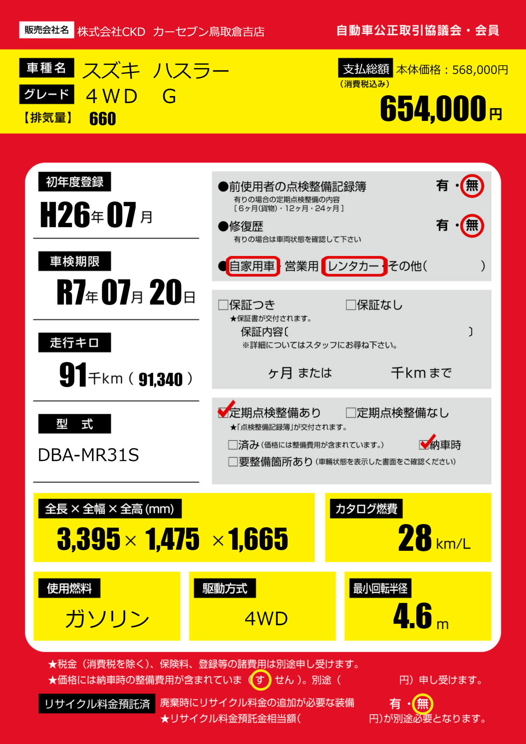 | 走行キロ | 9.1万km | 初年度登録 | H26年07月 |