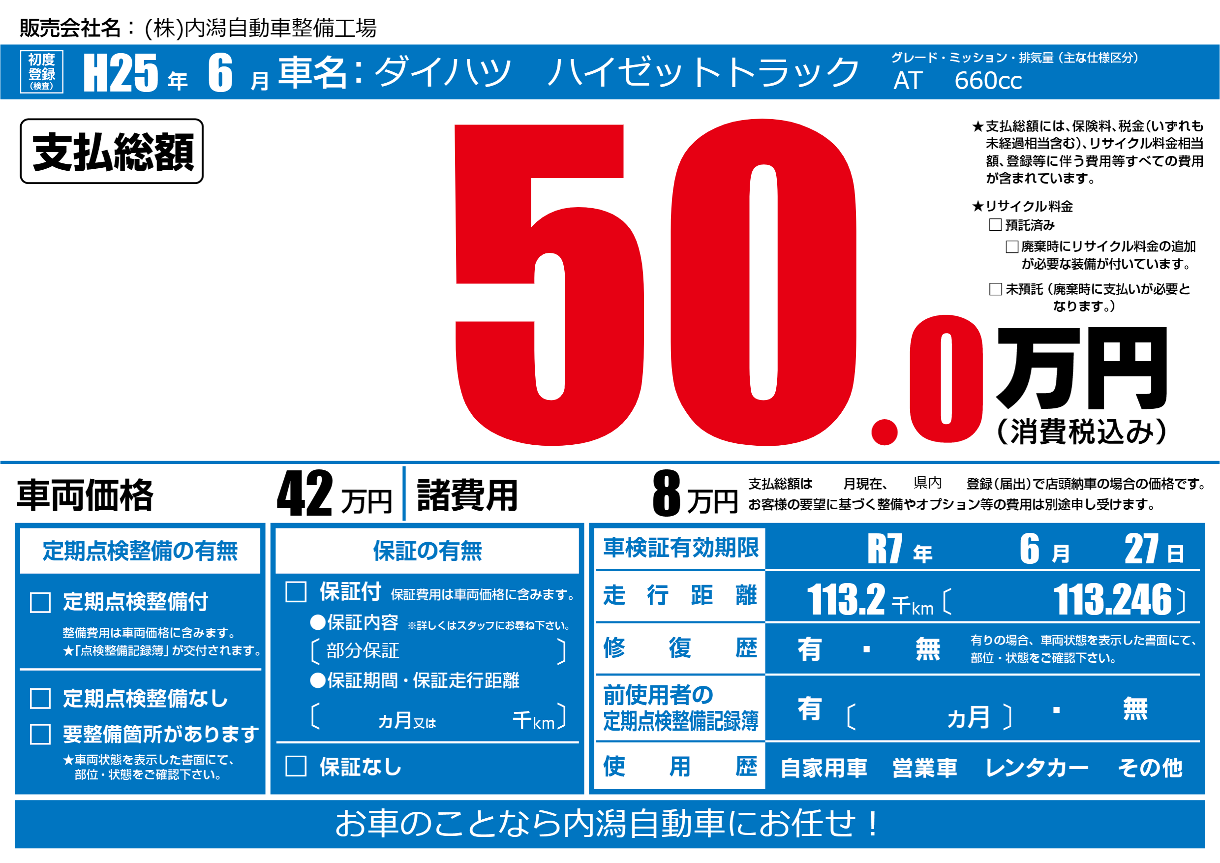 なし | 車検制限 | R7年6月27月 |