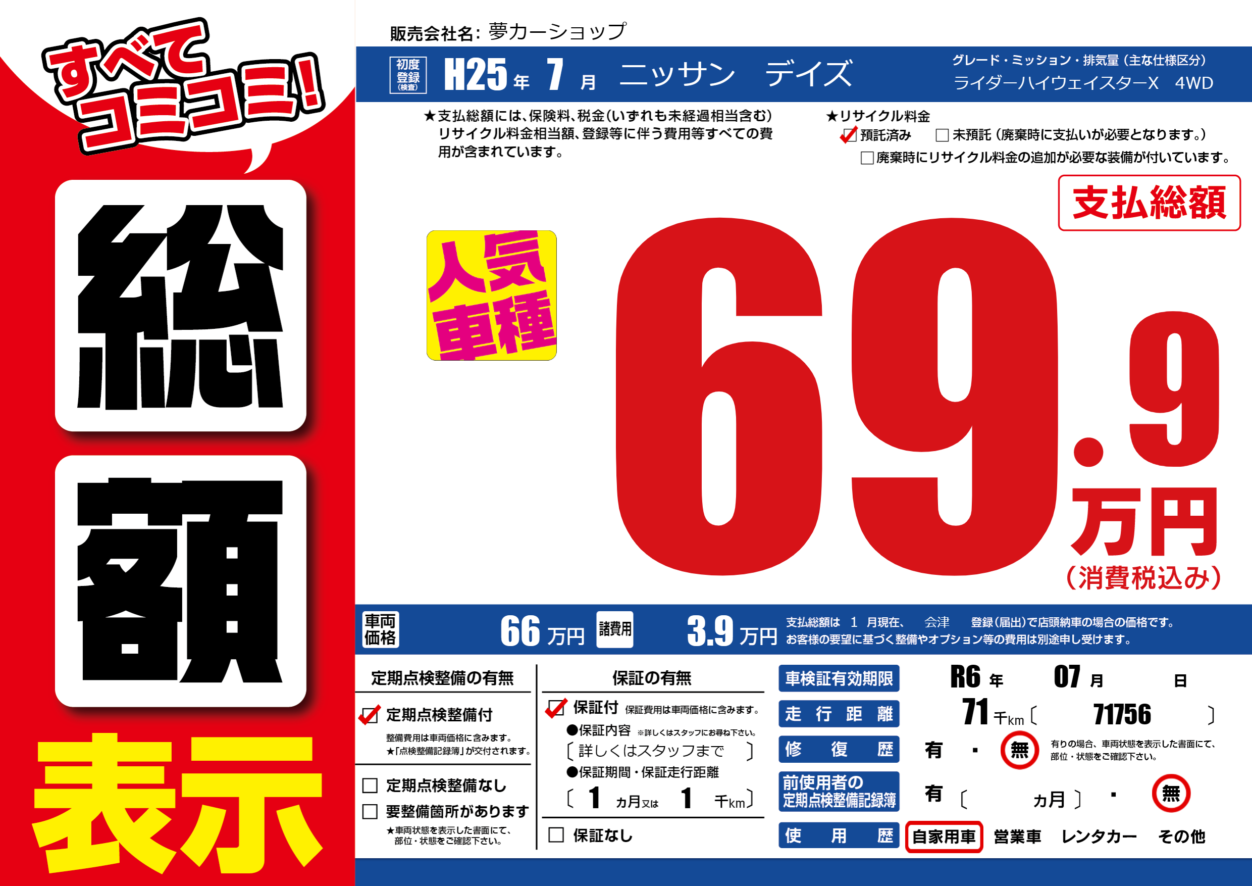| 車名 | ニッサン デイズ | グレード ミッション 排気量 |