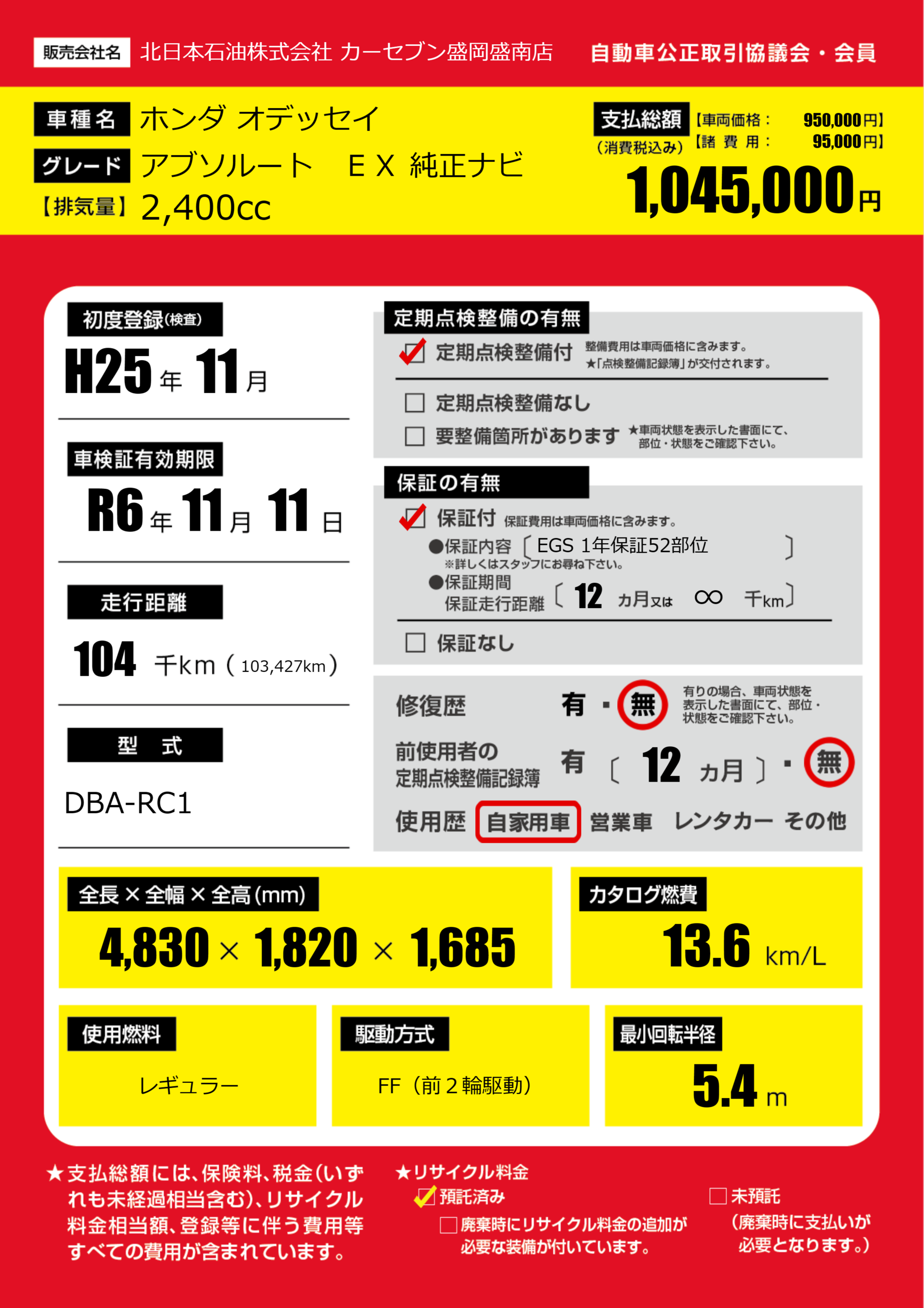 | 車名 | ホンダ オデッセイ | グレード ミッション 排気量 |