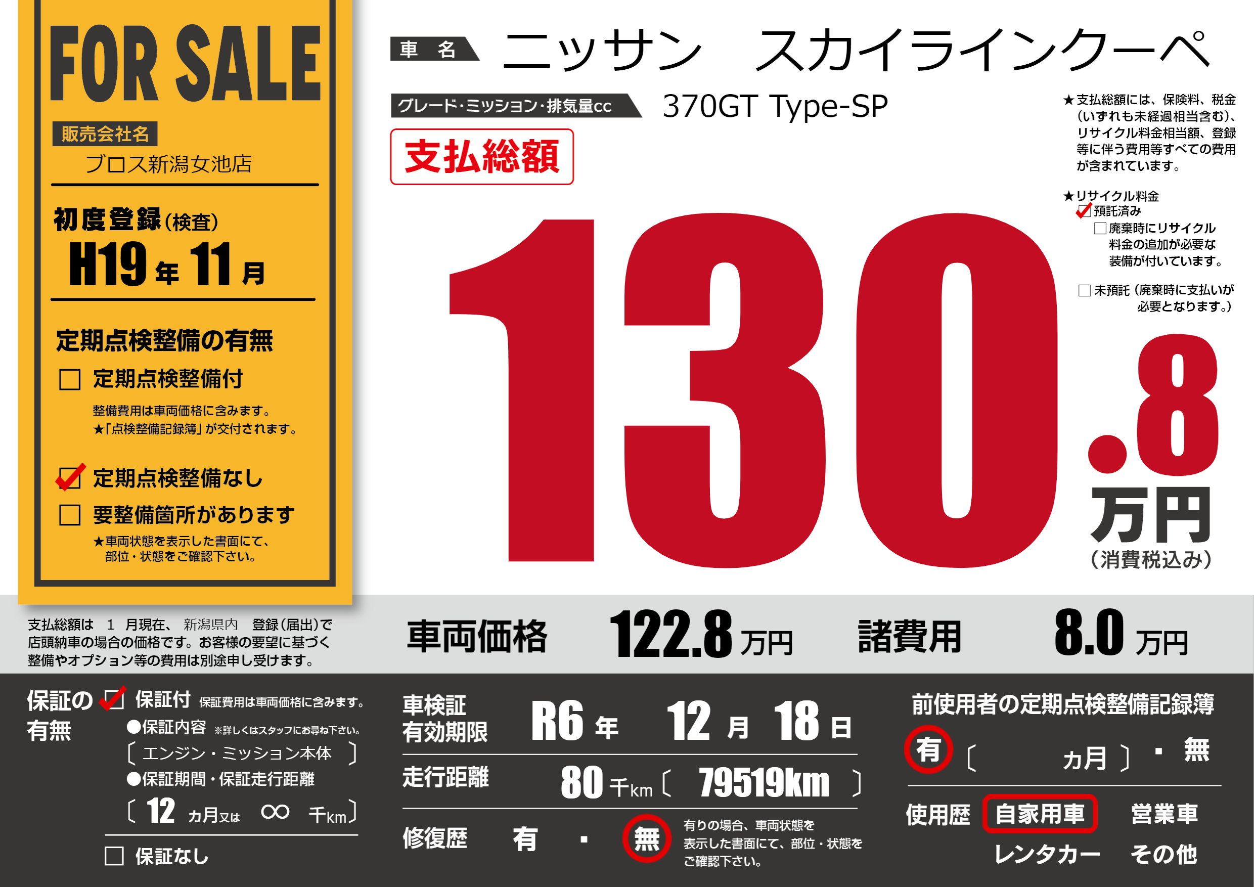 | 車名 | ニッサン スカイラインクーペ | グレード ミッション 排気量 |
