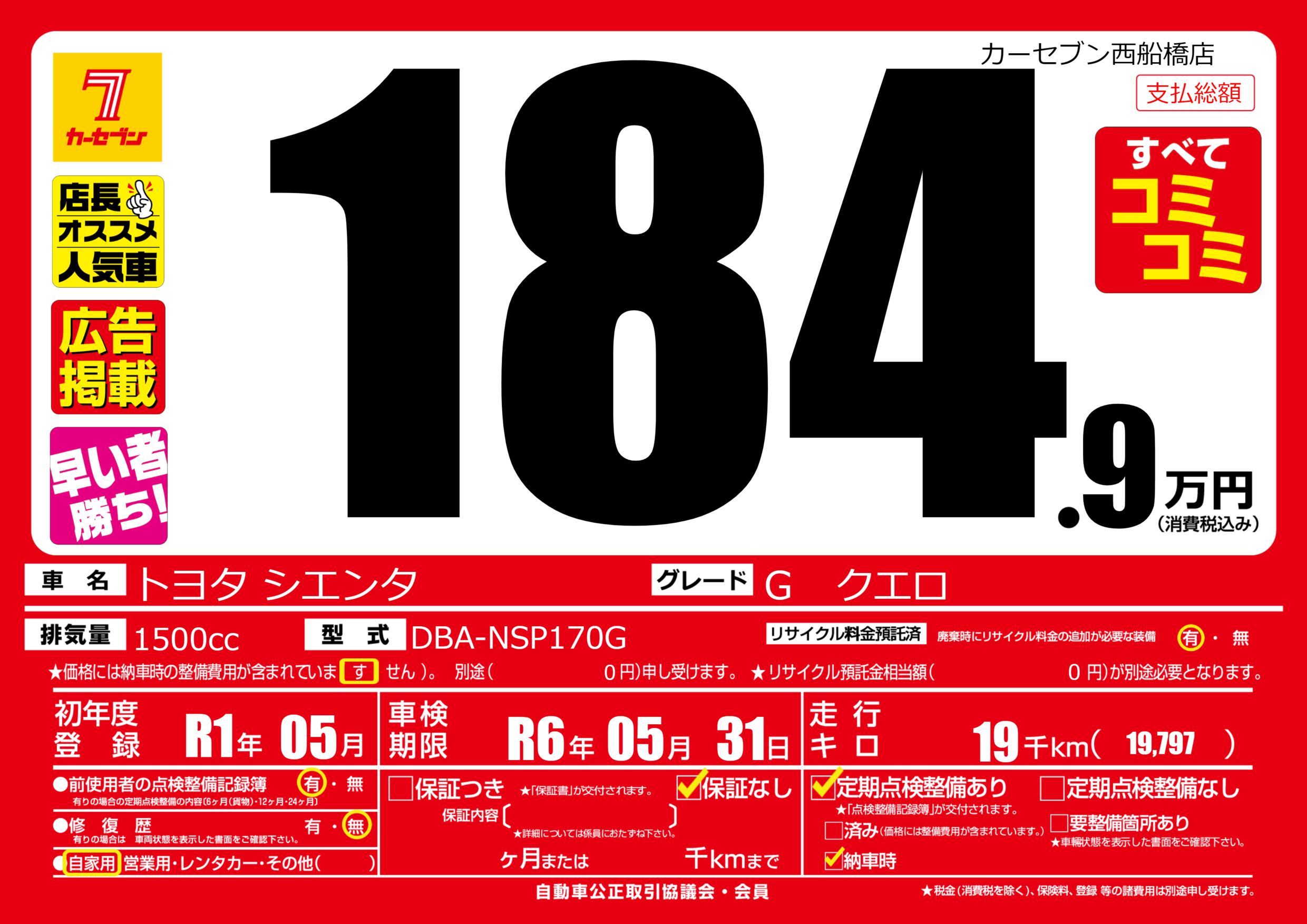 | 車名 | トヨタ シエンタ | グレード ミッション 排気量 |