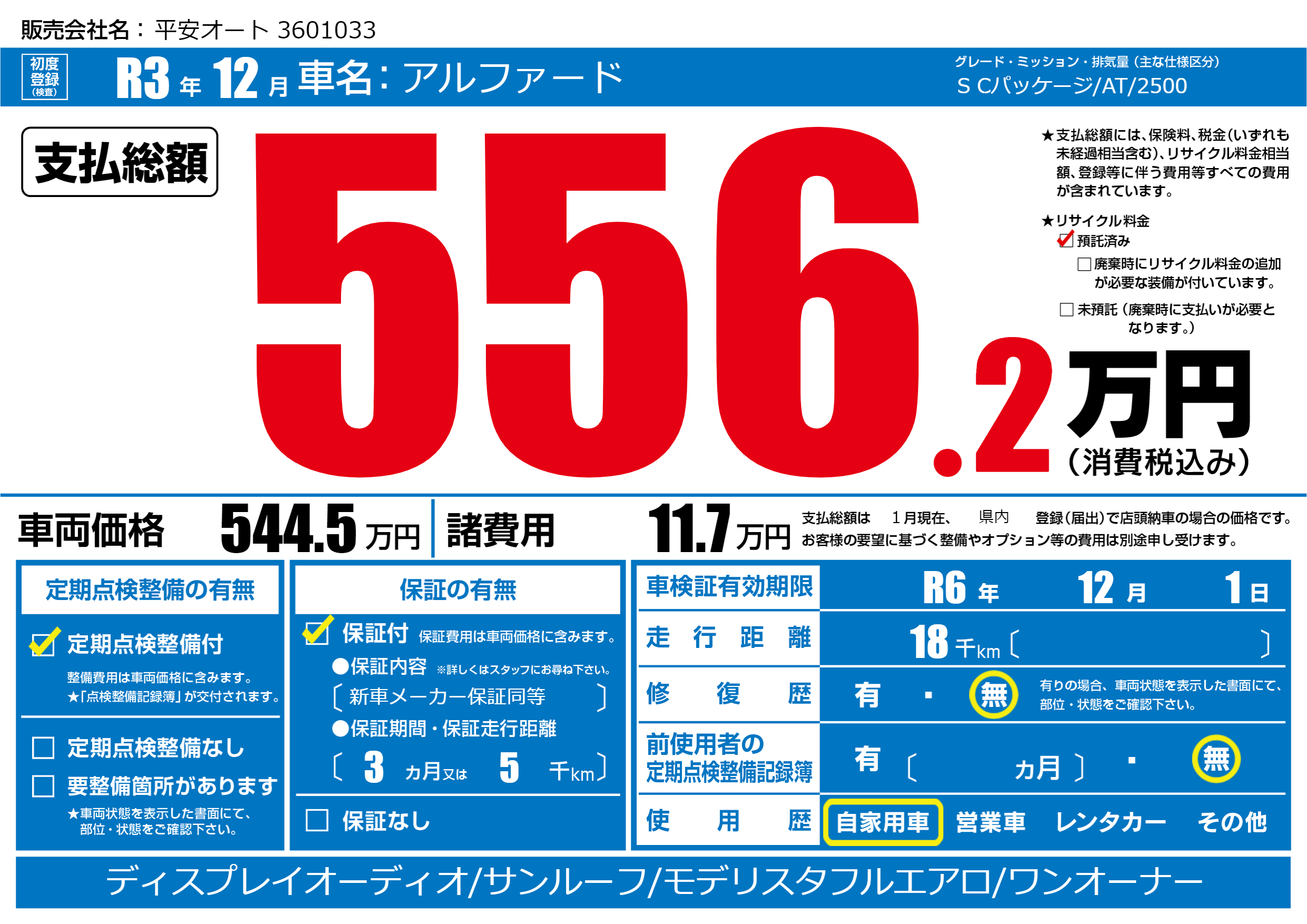 | 車名 | アルファード | グレード ミッション 排気量 |