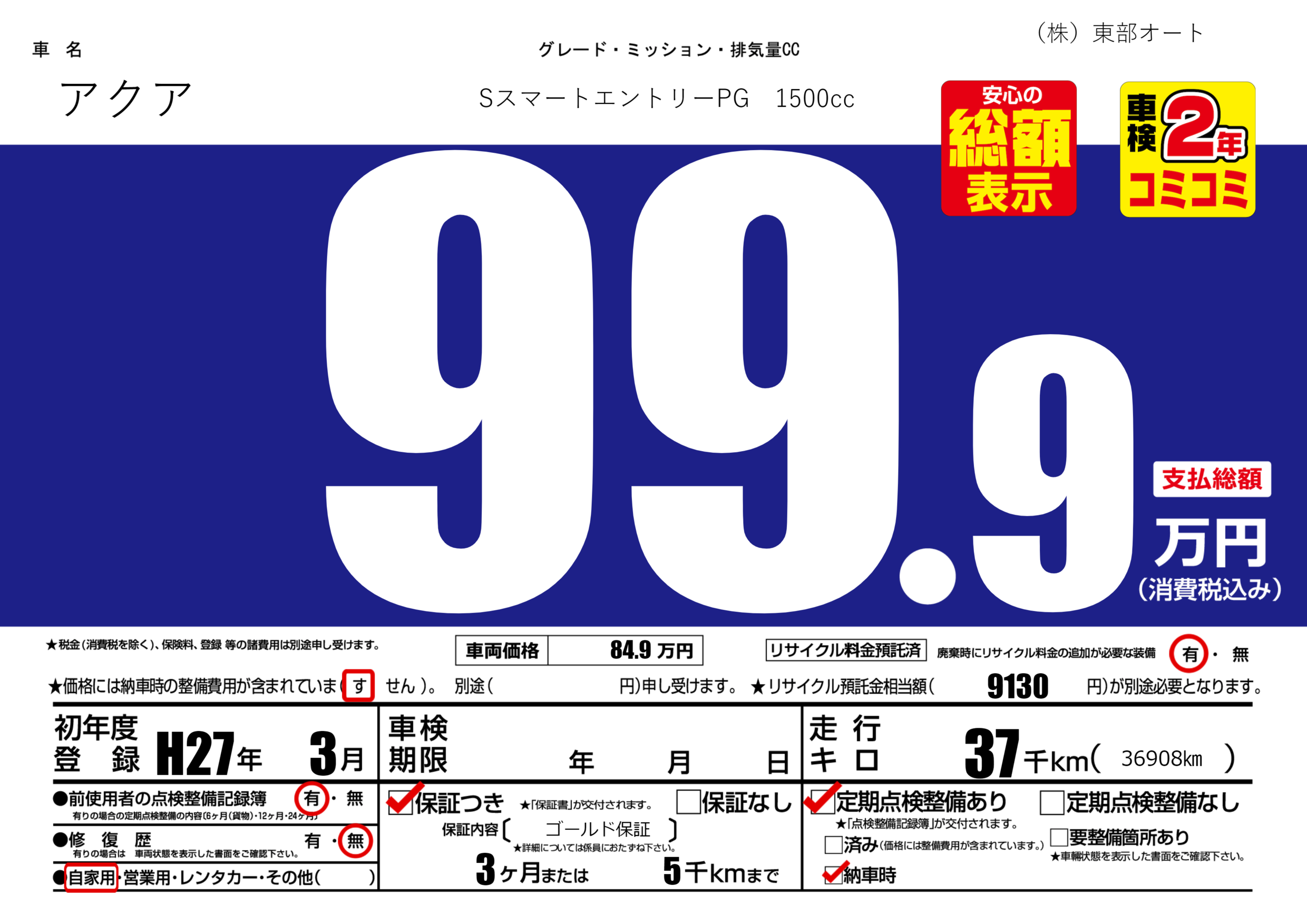 | 定期点検整備 | 定期点検整備あり 納車時あり | ||