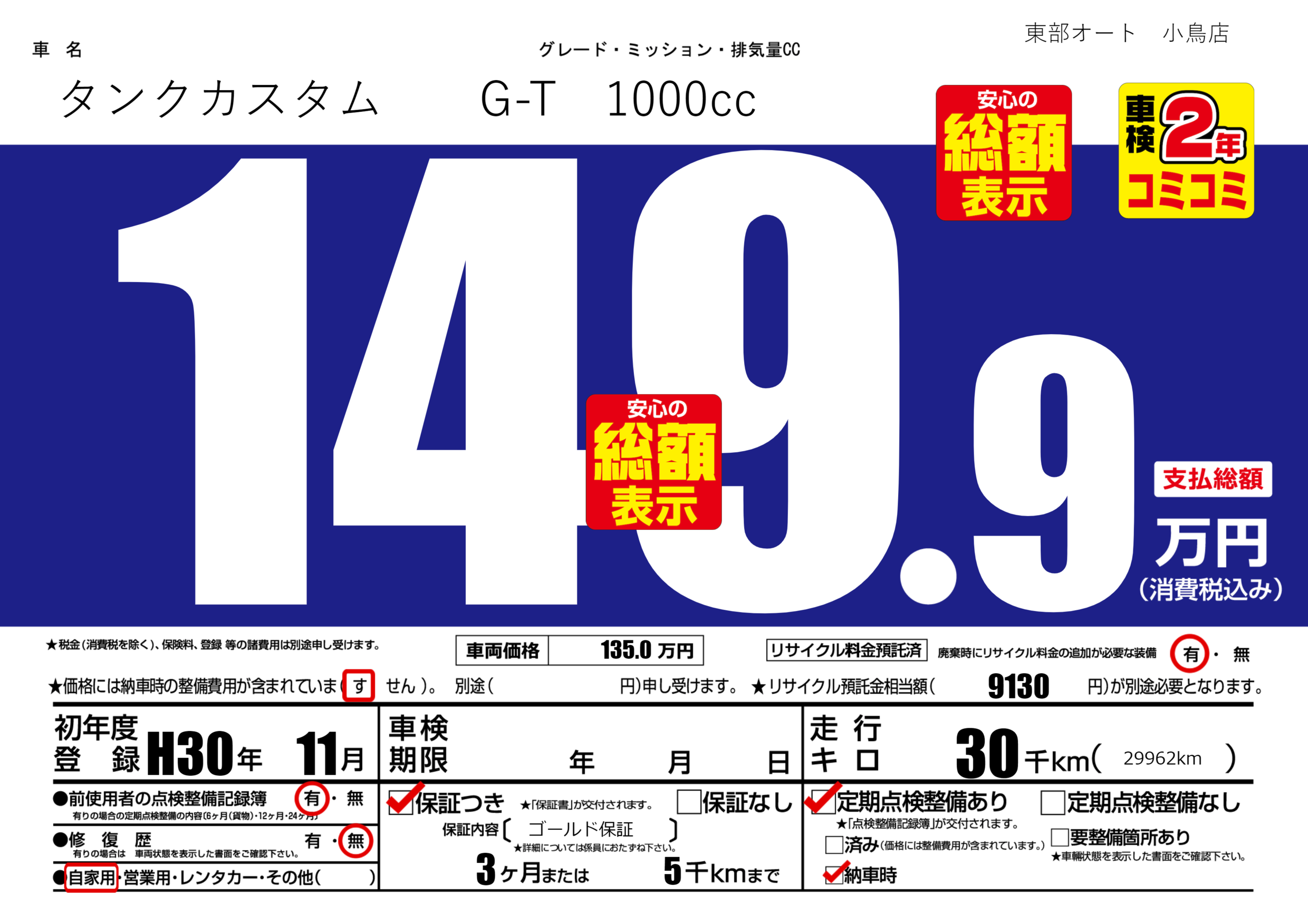 | 車名 | タンクカスタム | グレード ミッション 排気量 |