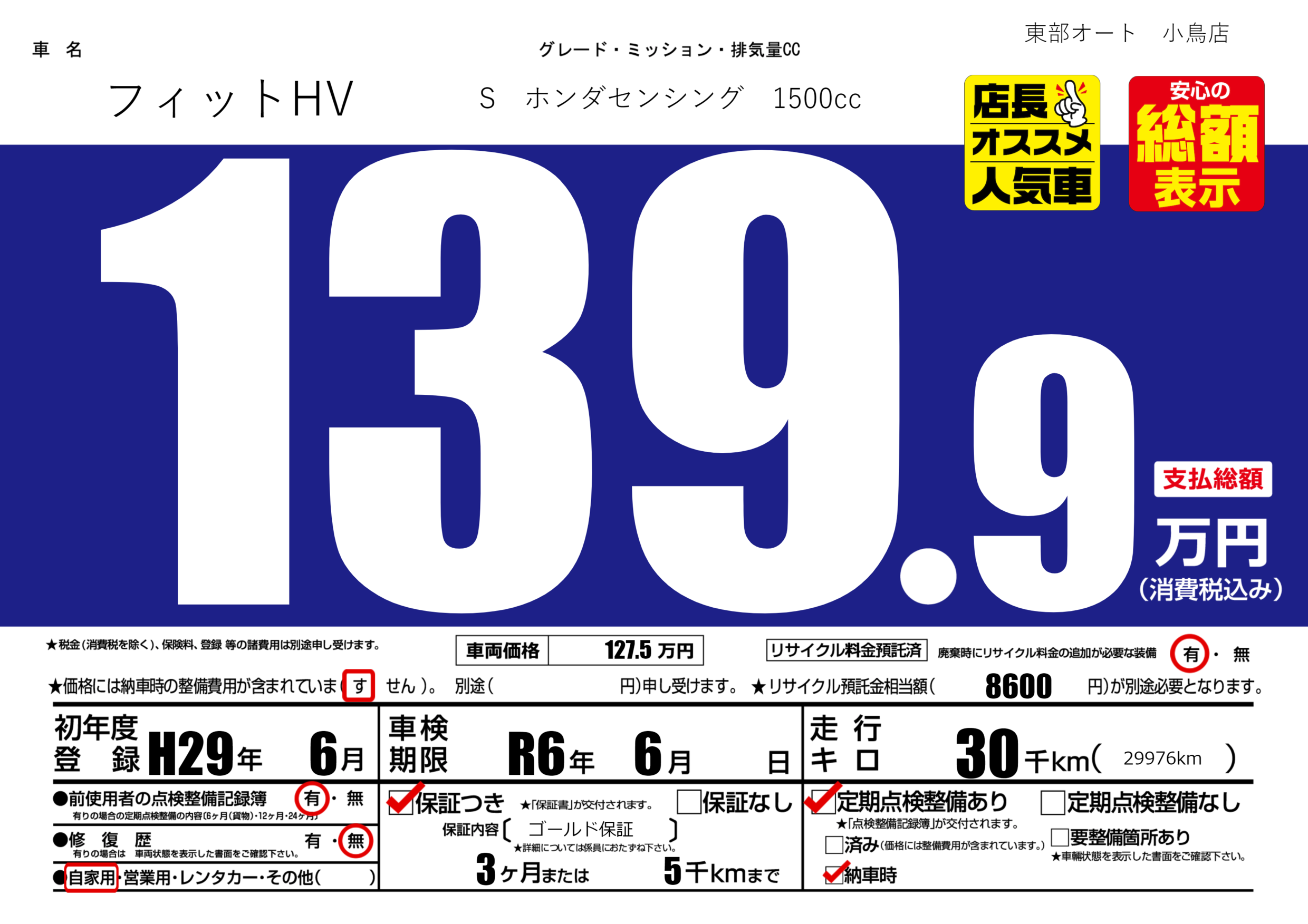 | 車名 | フィットHV | グレード ミッション 排気量 |