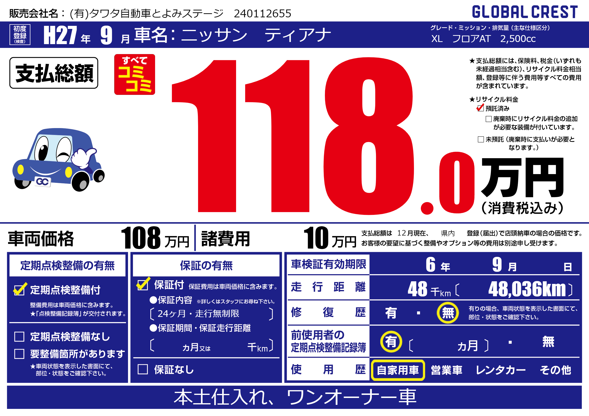| 車名 | ニッサン ティアナ | グレード ミッション 排気量 |