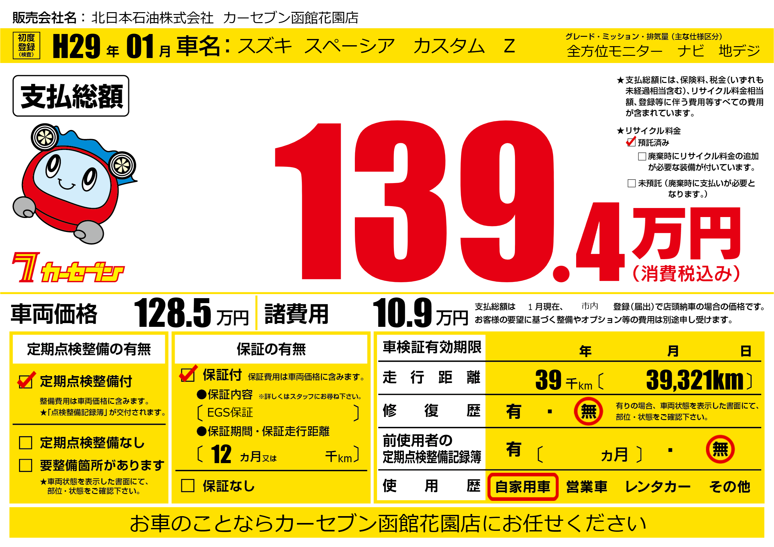 | 走行キロ | 3.9万km | 初年度登録 | H29年01月 |
