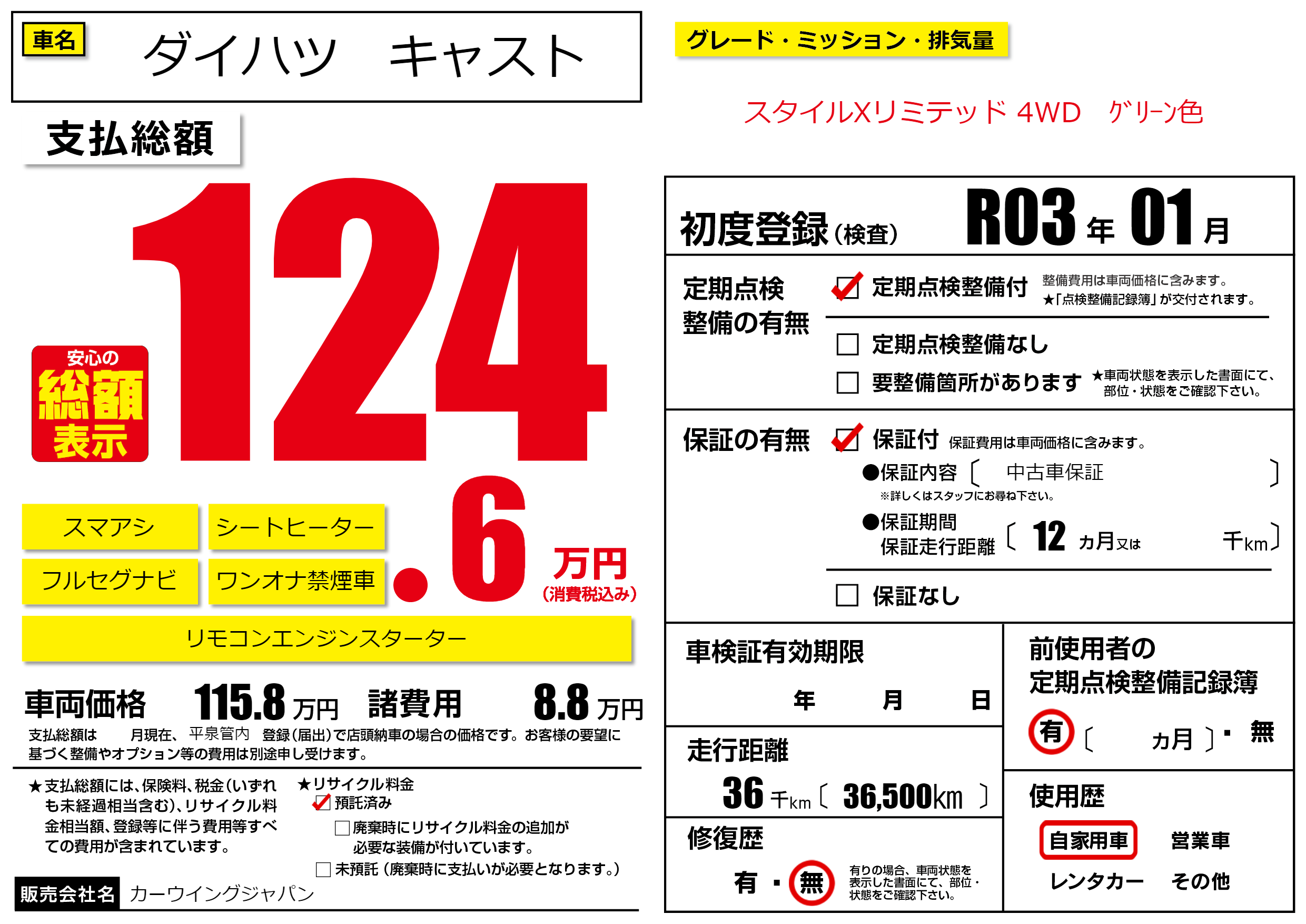 | 車名 | ダイハツ キャスト | グレード ミッション 排気量 |