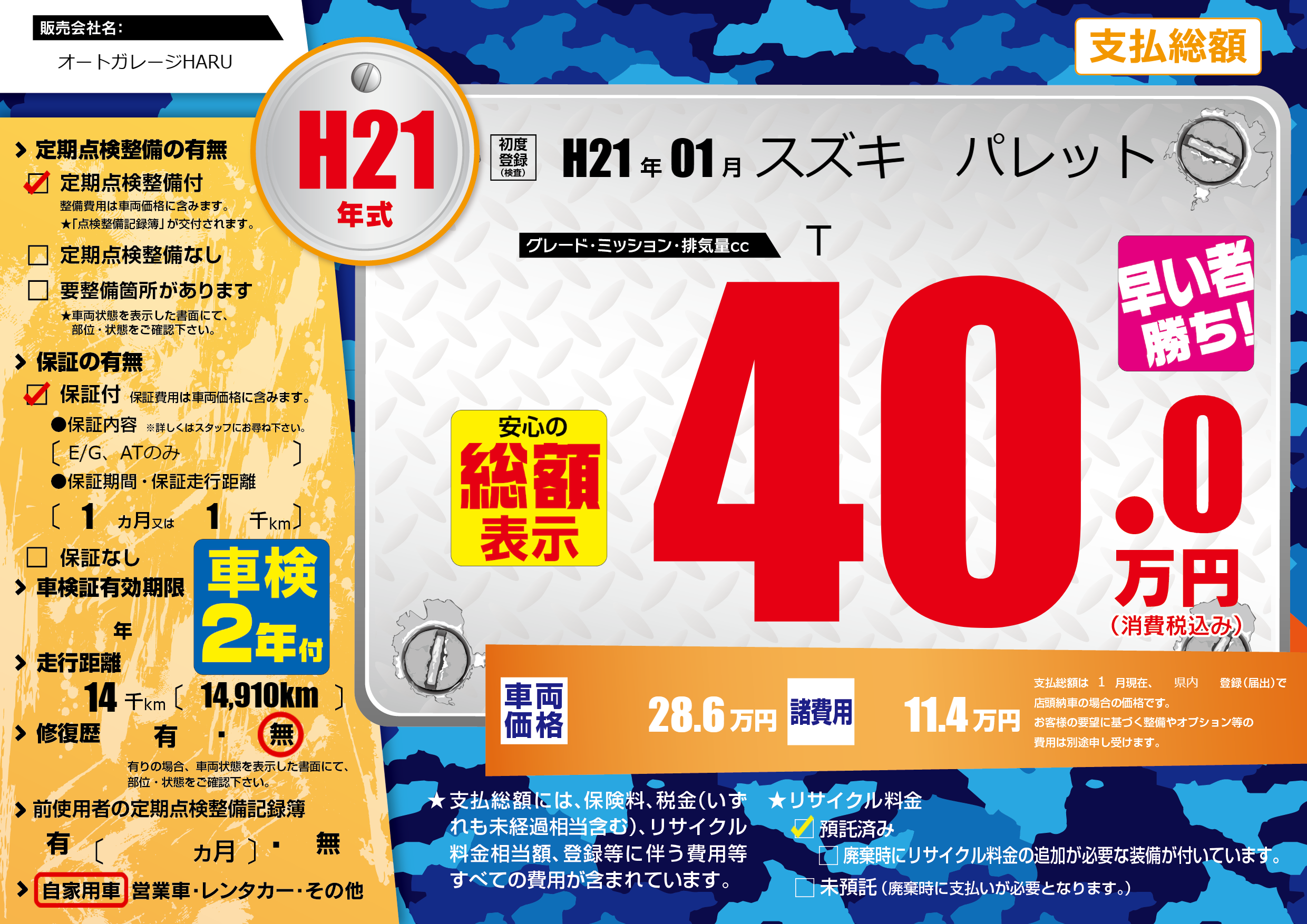 | 車名 | スズキ パレット | グレード ミッション 排気量 |