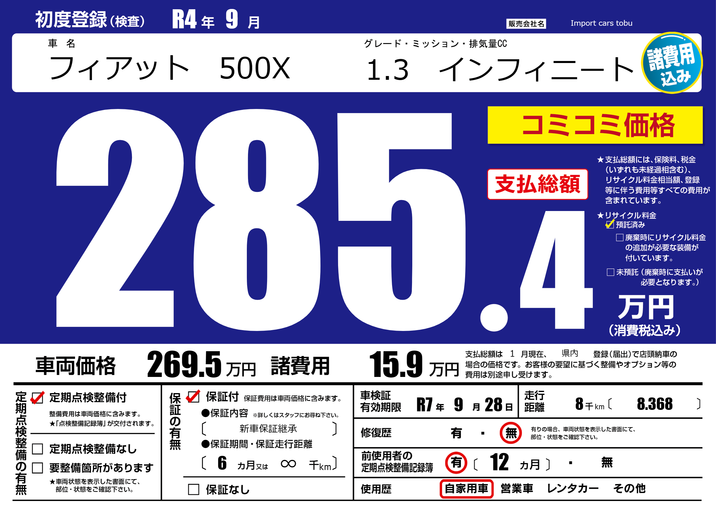 | 車名 | フィアット 500X | グレード ミッション 排気量 |