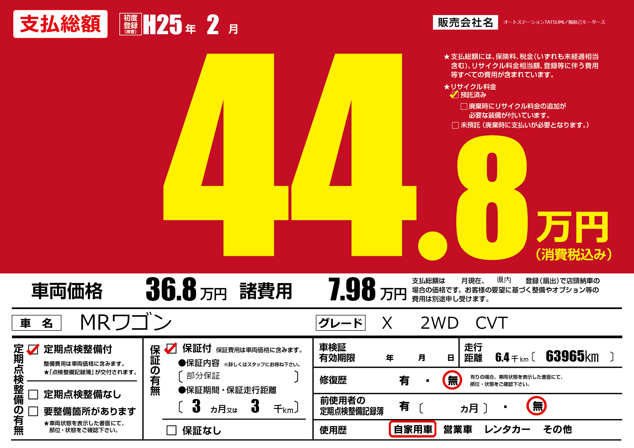 | 車名 | MRワゴン | グレード ミッション 排気量 |