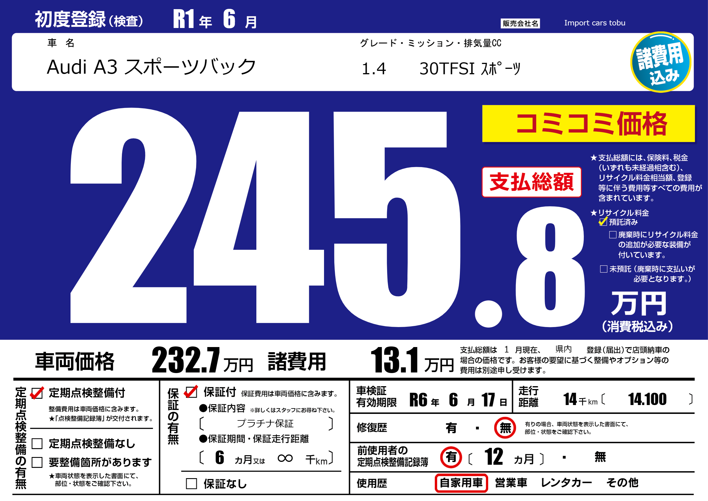 保証付き 保証内容( プラチナ保証) 6ヶ月または(∞)千kmまで |