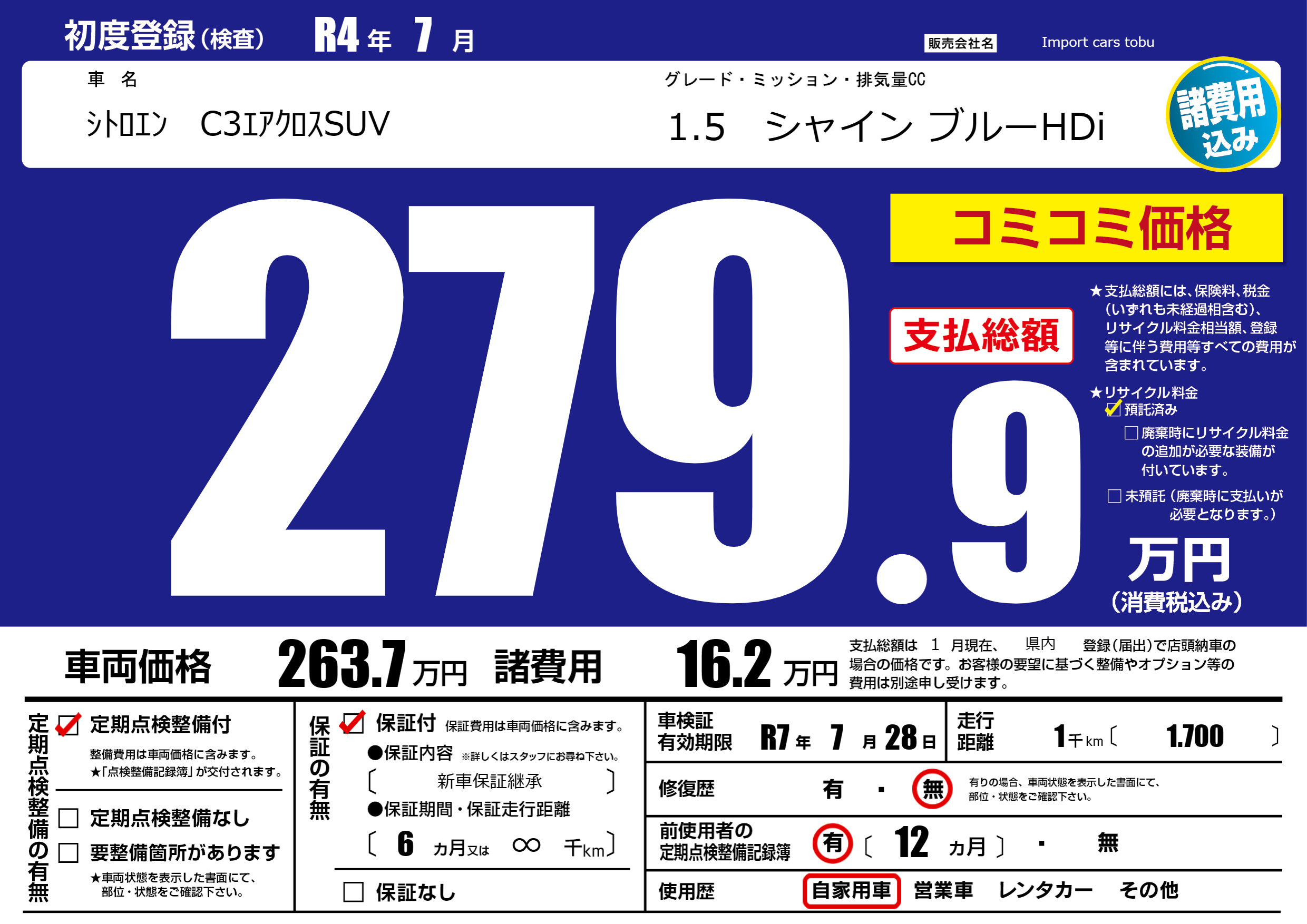 | 車名 | シトロエン C3エアクロスSUV | グレード ミッション 排気量 |