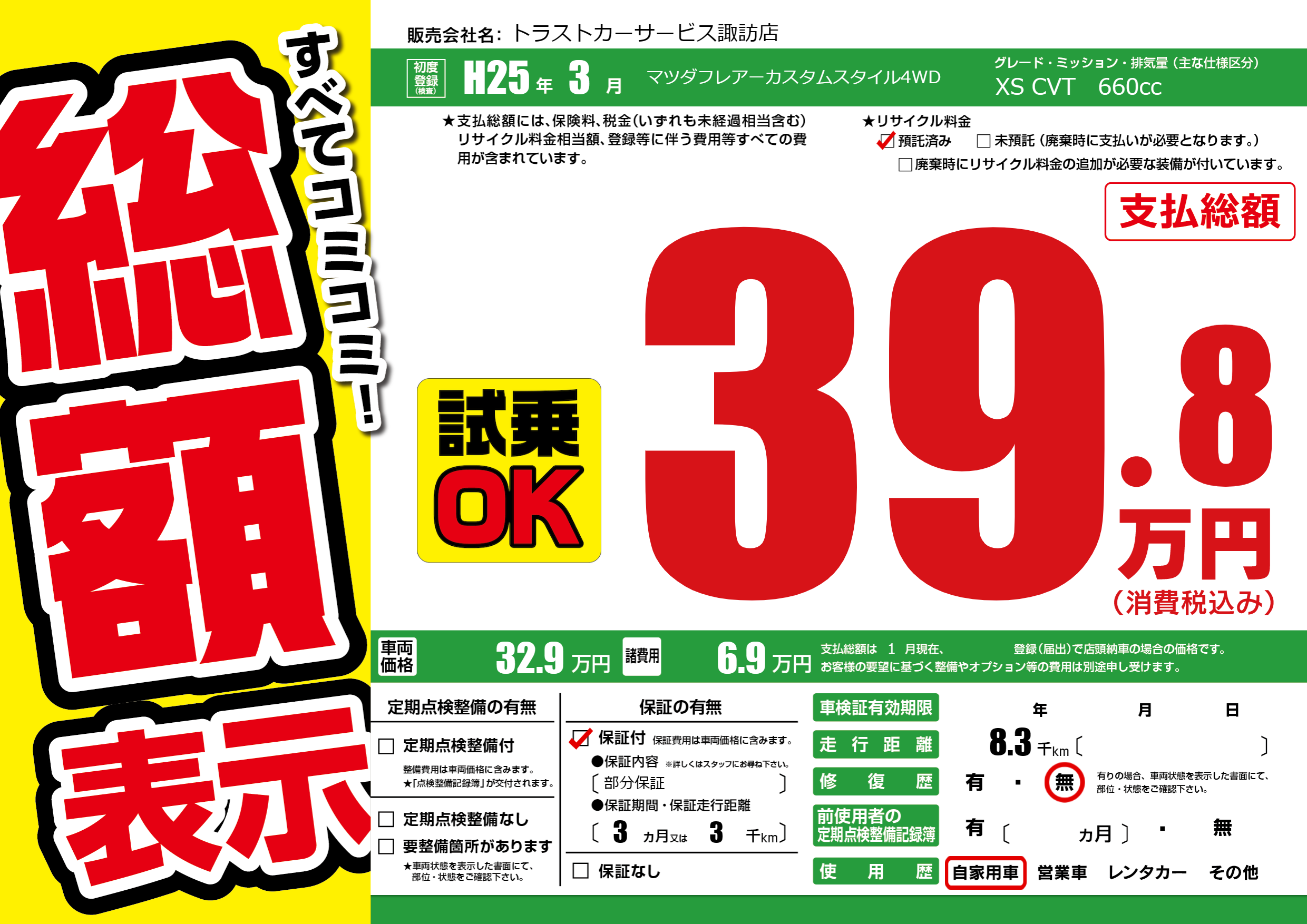 | 車名 | マツダフレアーカスタムスタイル4WD | グレード ミッション 排気量 |