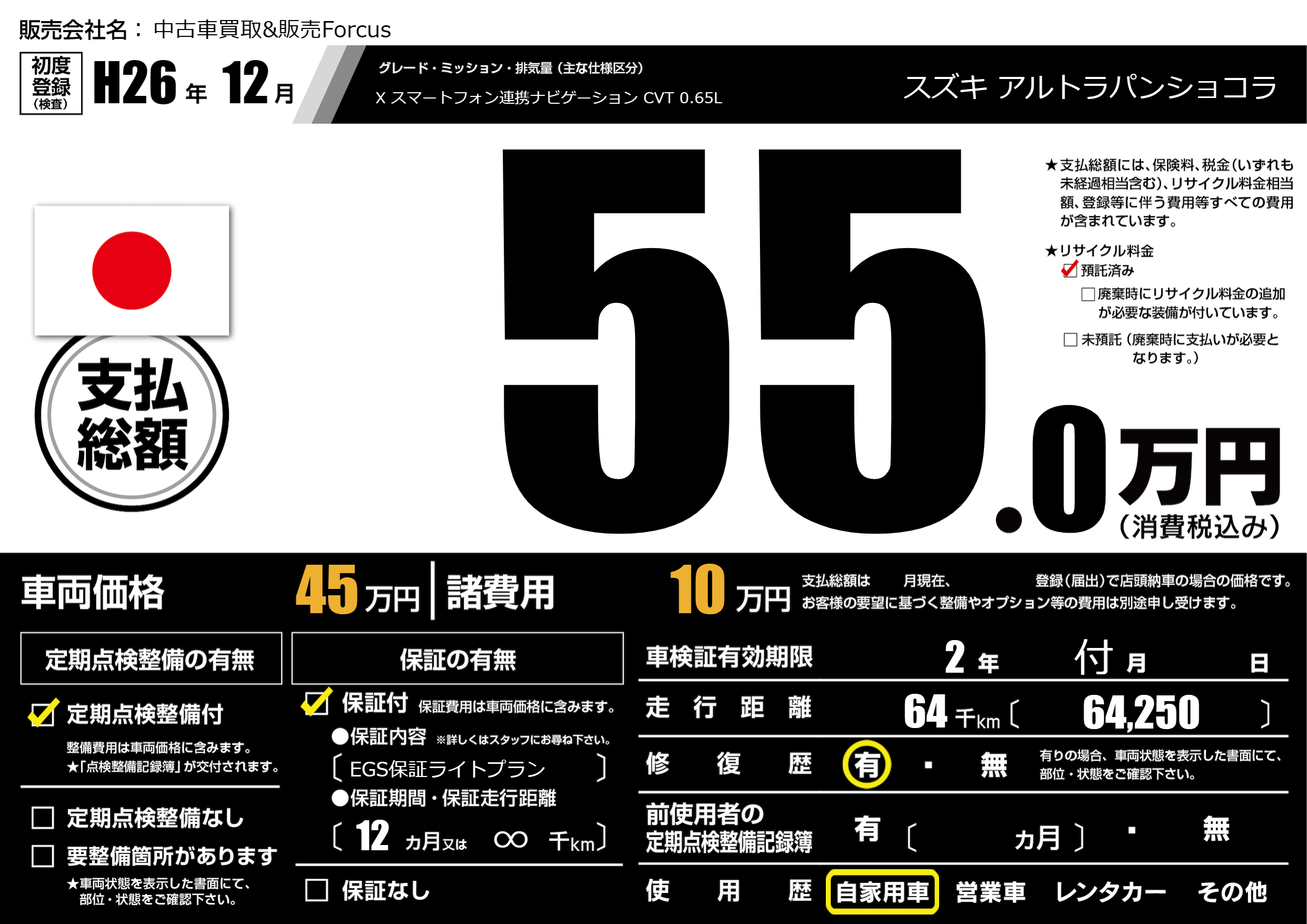 保証付き 保証内容(EGS保証ライトプラン) 12ヶ月または(∞)千kmまで |