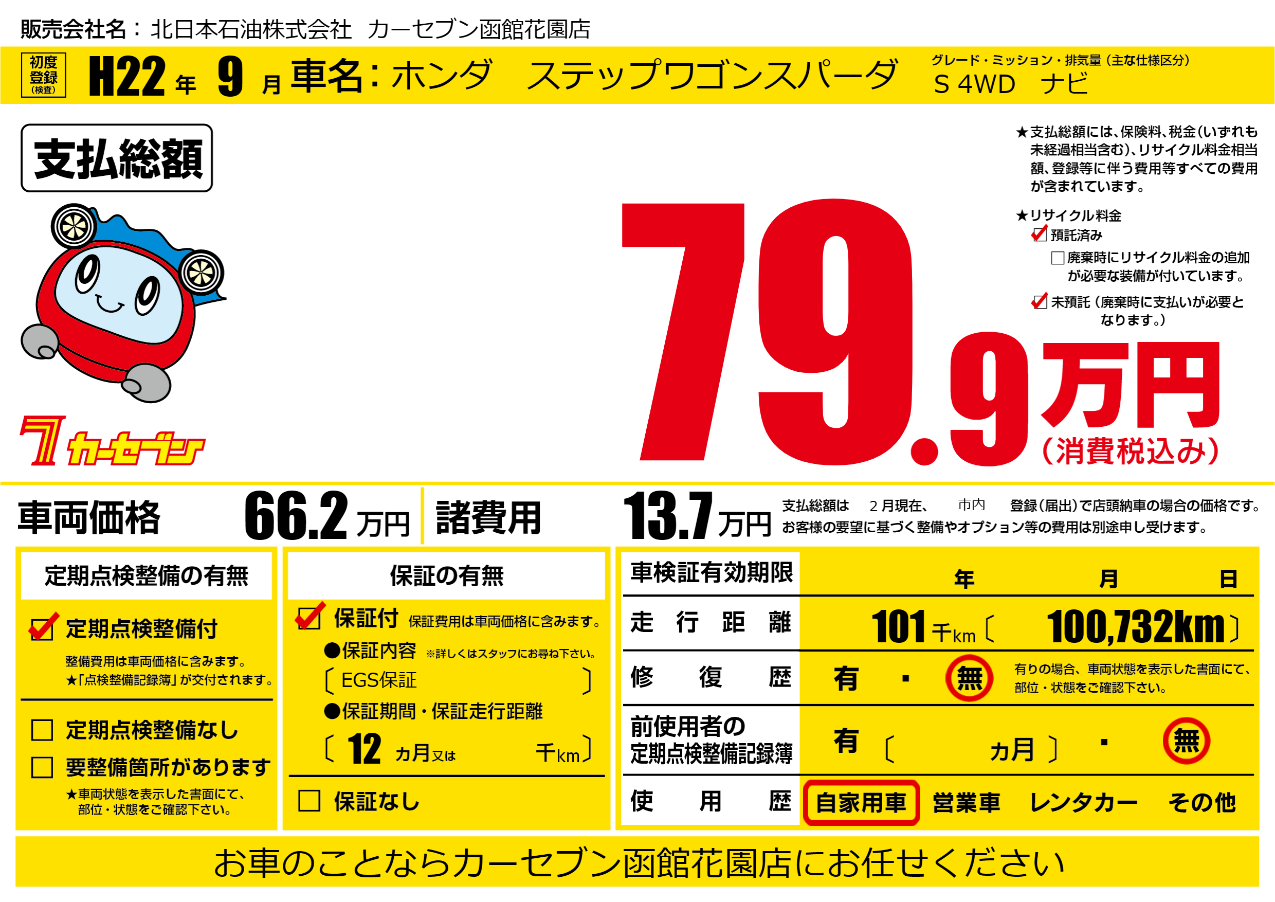 | 走行キロ | 10.1万km | 初年度登録 | H22年9月 |