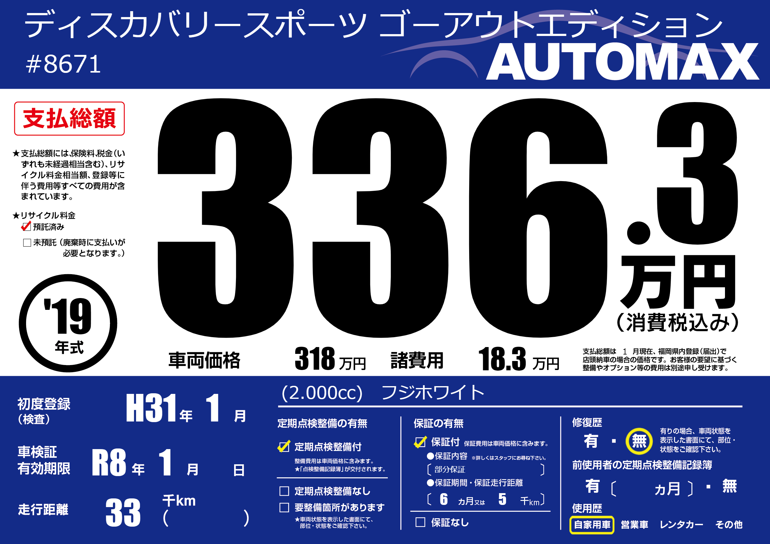 | 走行キロ | 3.3万km | 初年度登録 | H31年1月 |