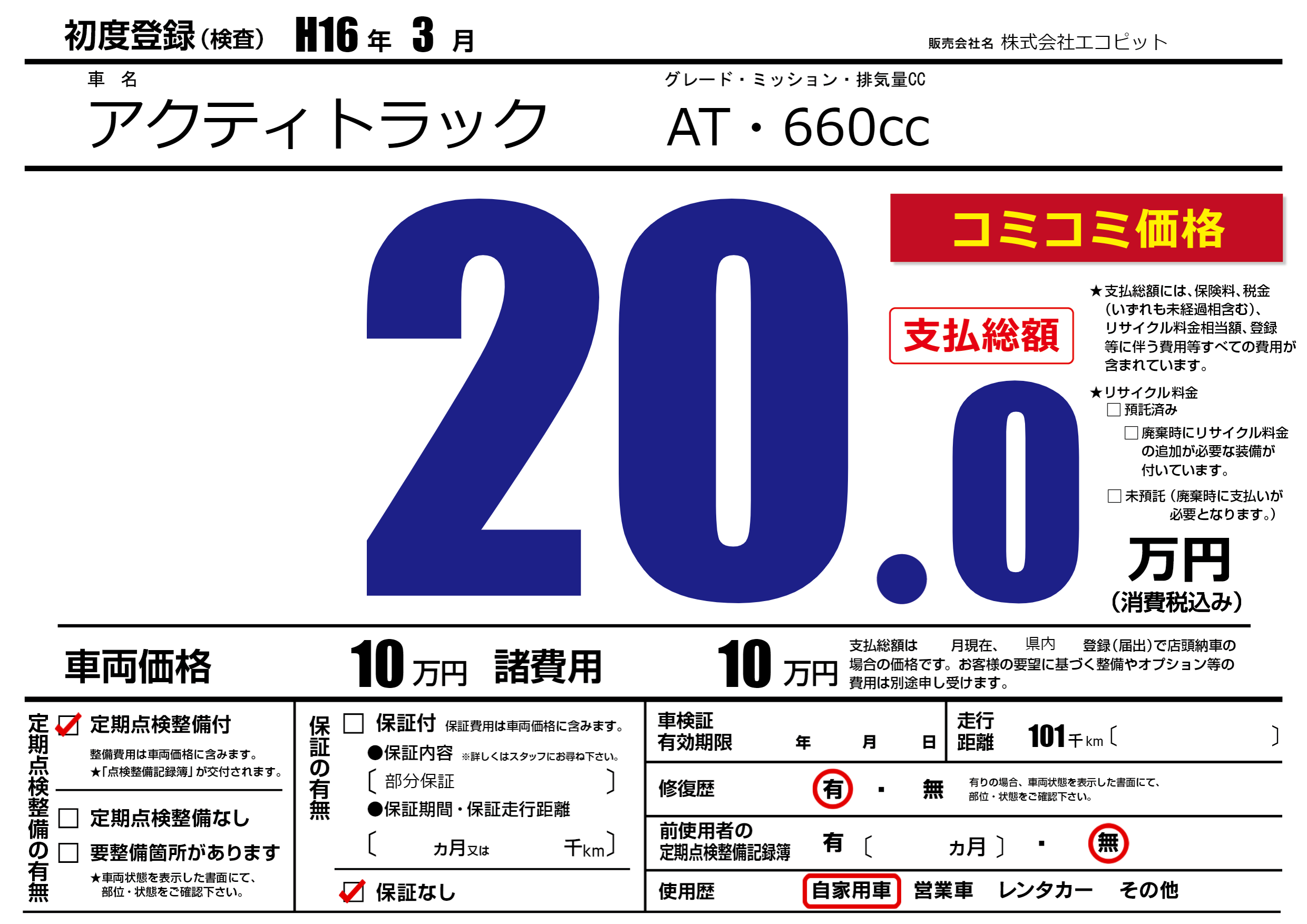 | 車名 | アクティトラック | グレード ミッション 排気量 |