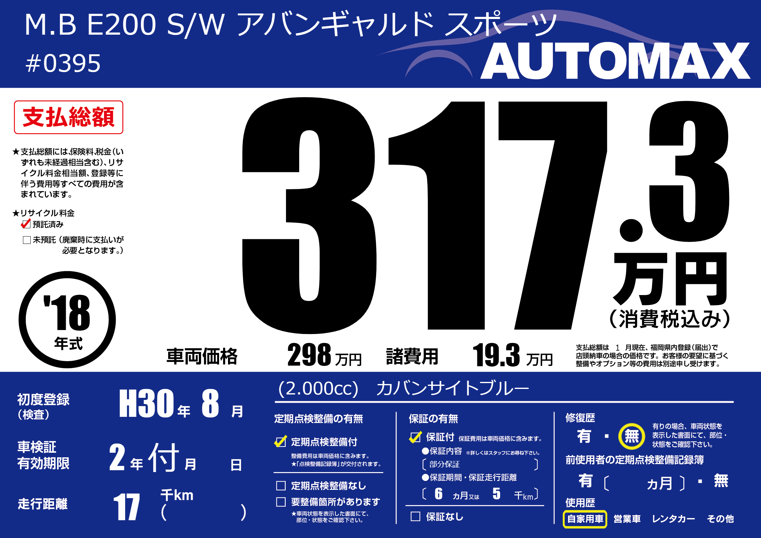 | 車名 | M.B E200 S/W アバンギャルド スポーツ | グレード ミッション 排気量 |
