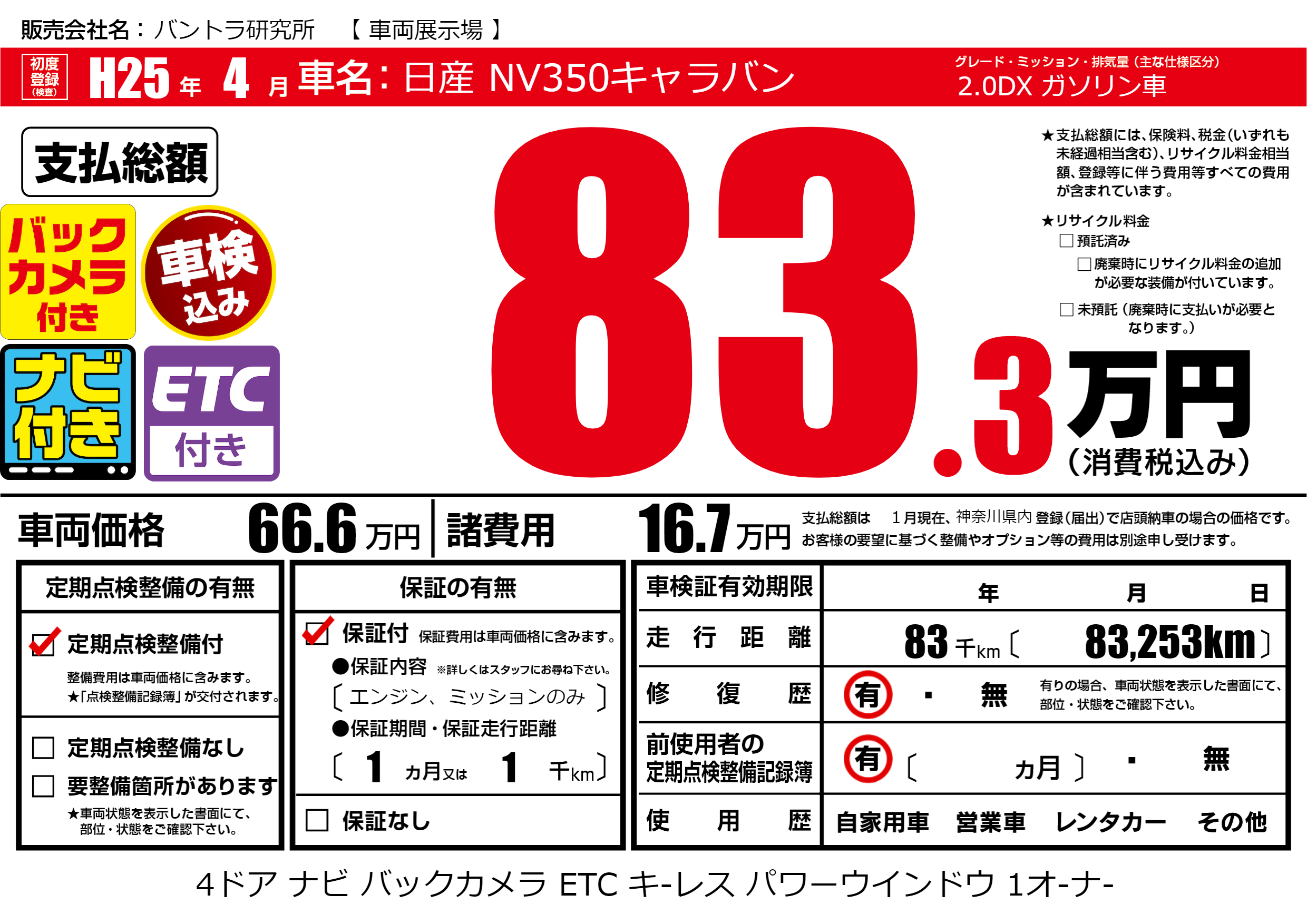 | 車名 | 日産 NV350キャラバン | グレード ミッション 排気量 |