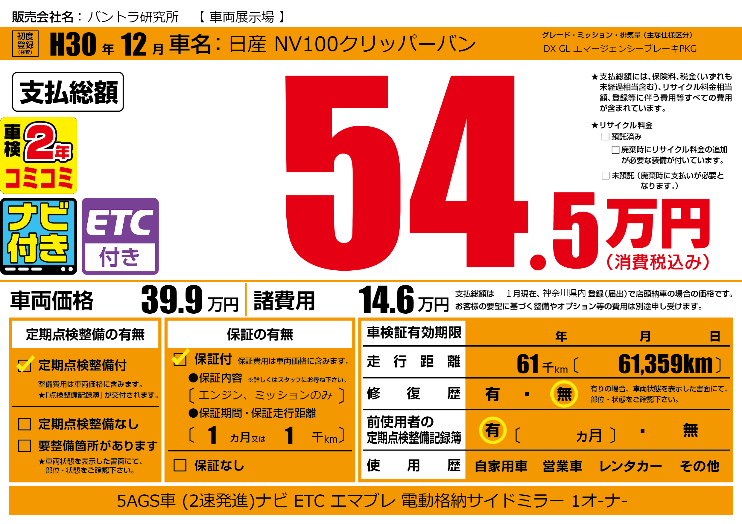 | 車名 | 日産 NV100クリッパーバン | グレード ミッション 排気量 |