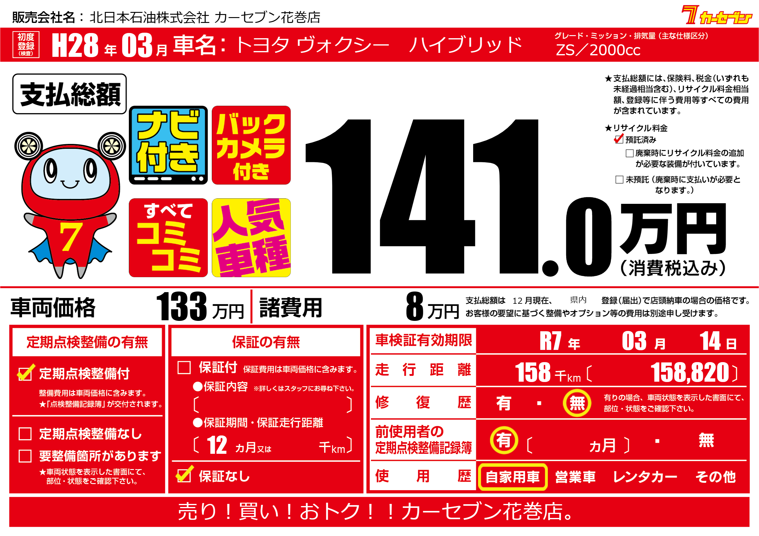 | 走行キロ | 15.8万km | 初年度登録 | H28年03月 |
