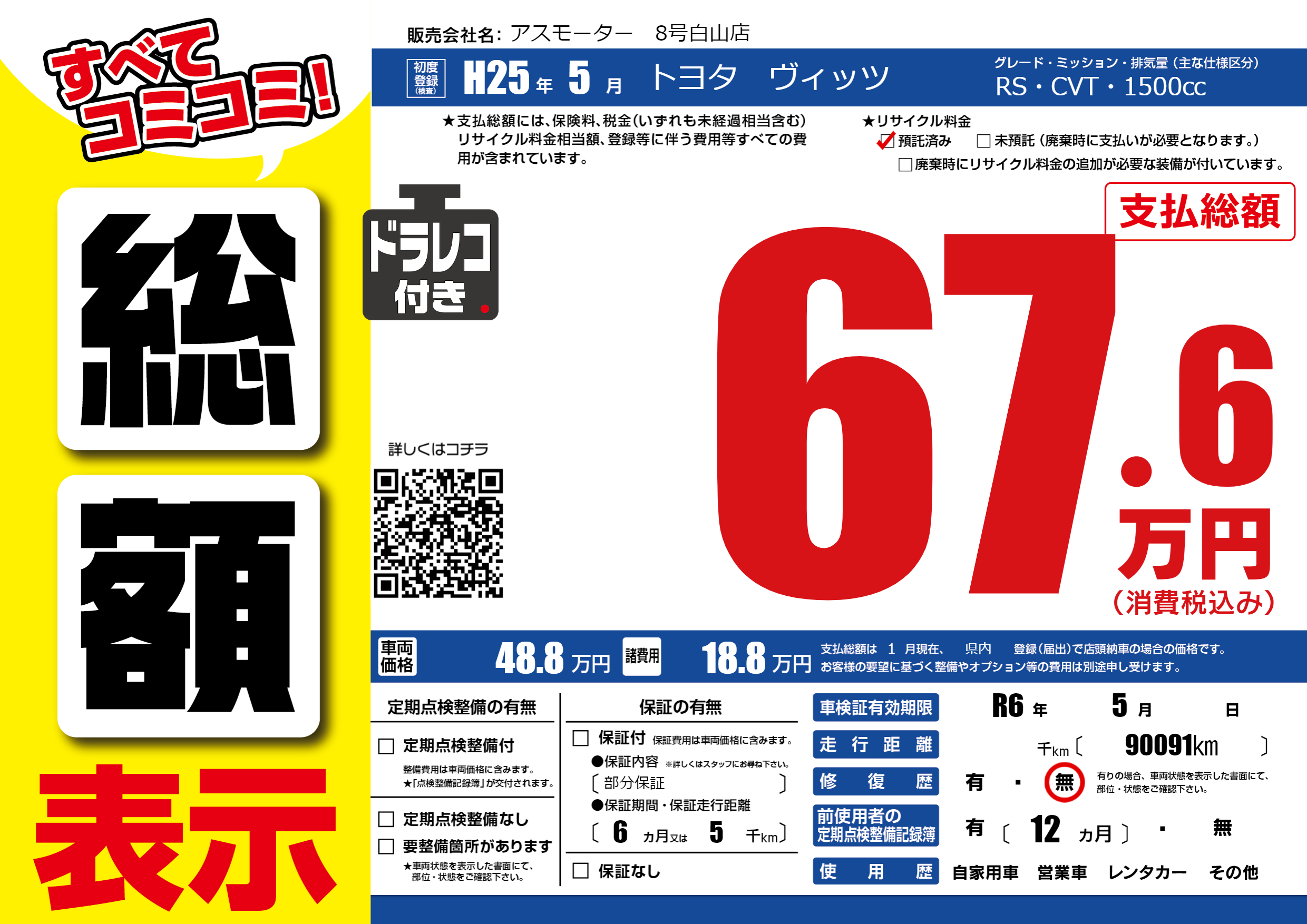 | 車名 | トヨタ ヴィッツ | グレード ミッション 排気量 |