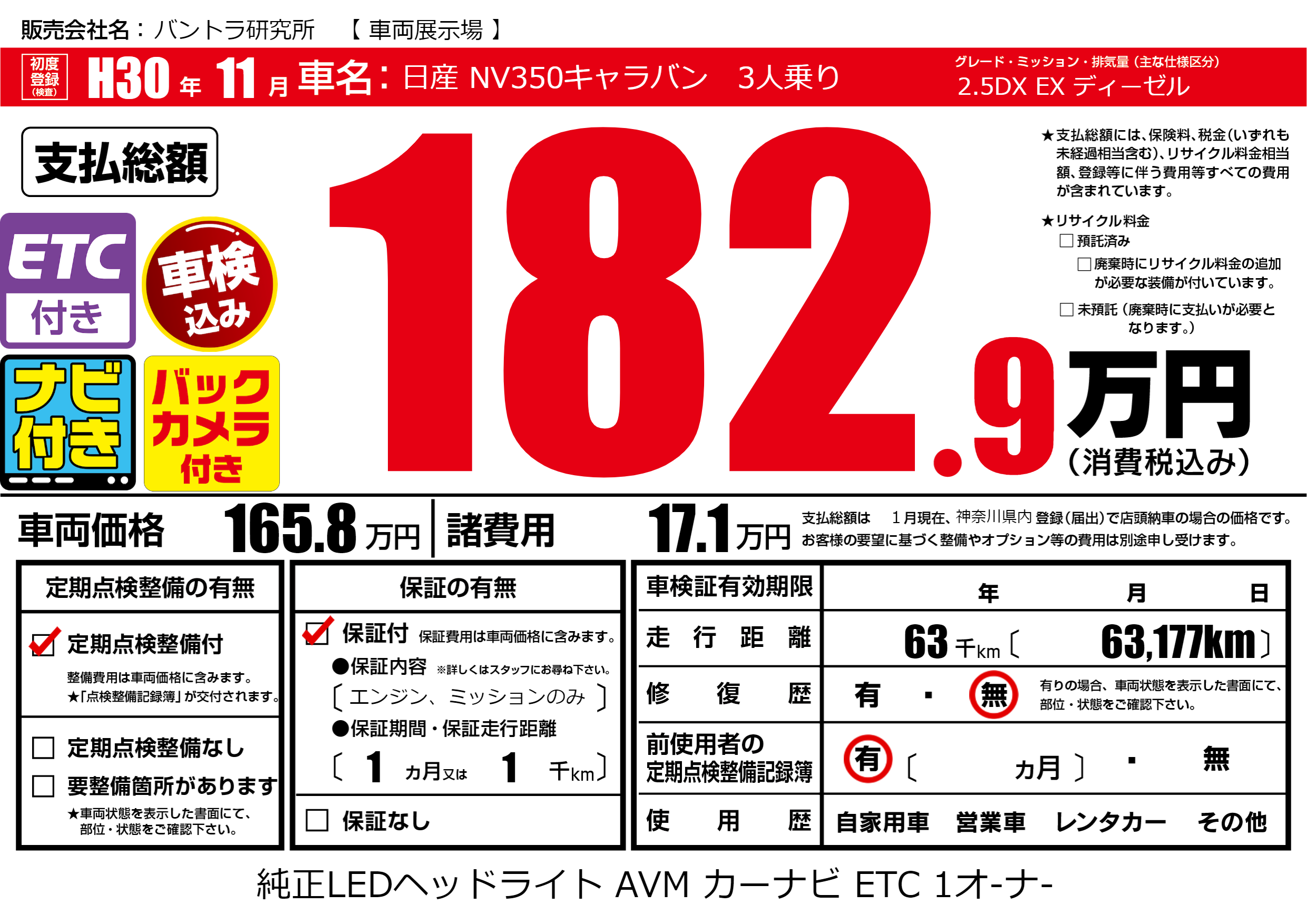| 車名 | 日産 NV350キャラバン 3人乗り | グレード ミッション 排気量 |