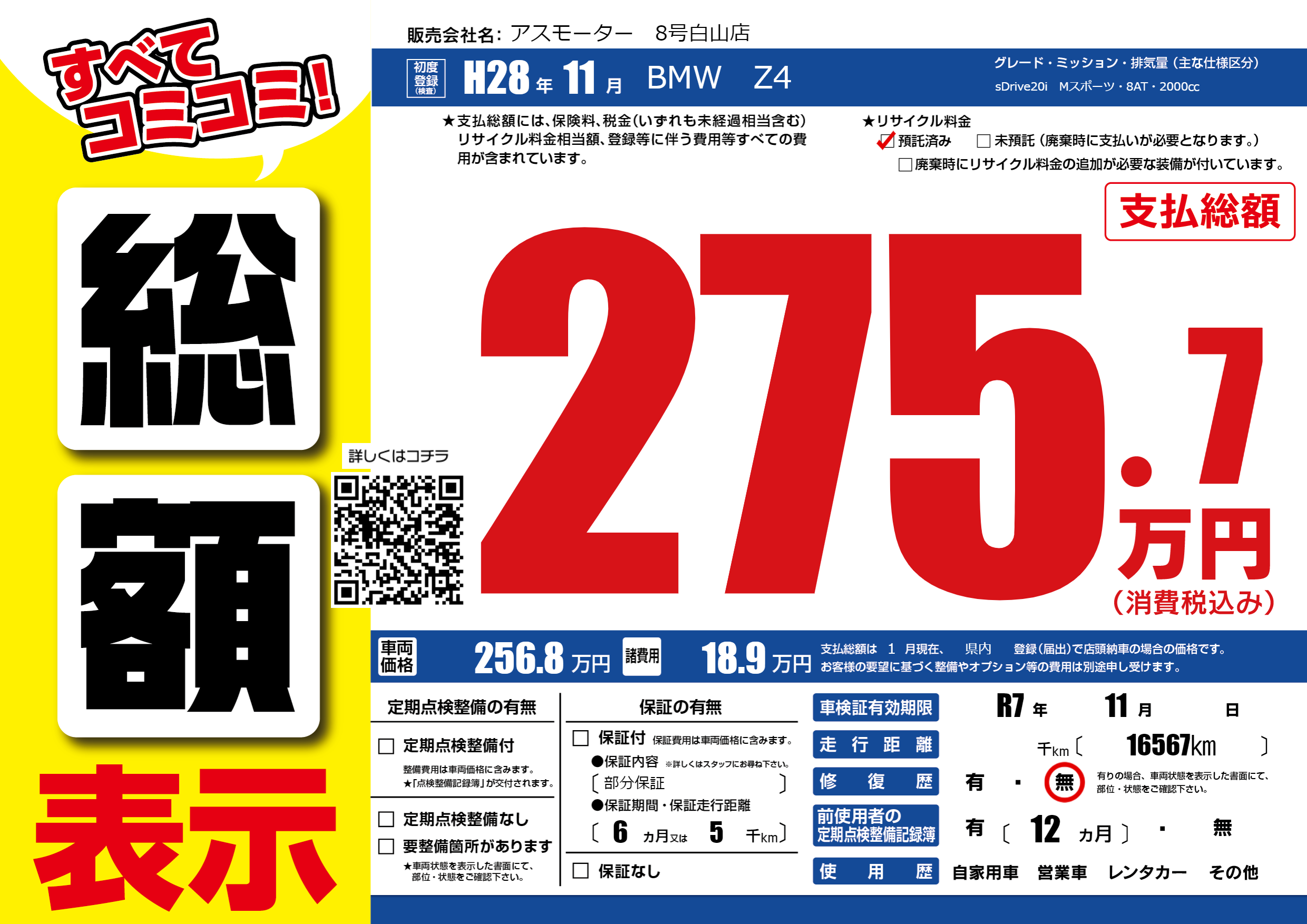 | 車名 | BMW Z4 | グレード ミッション 排気量 |