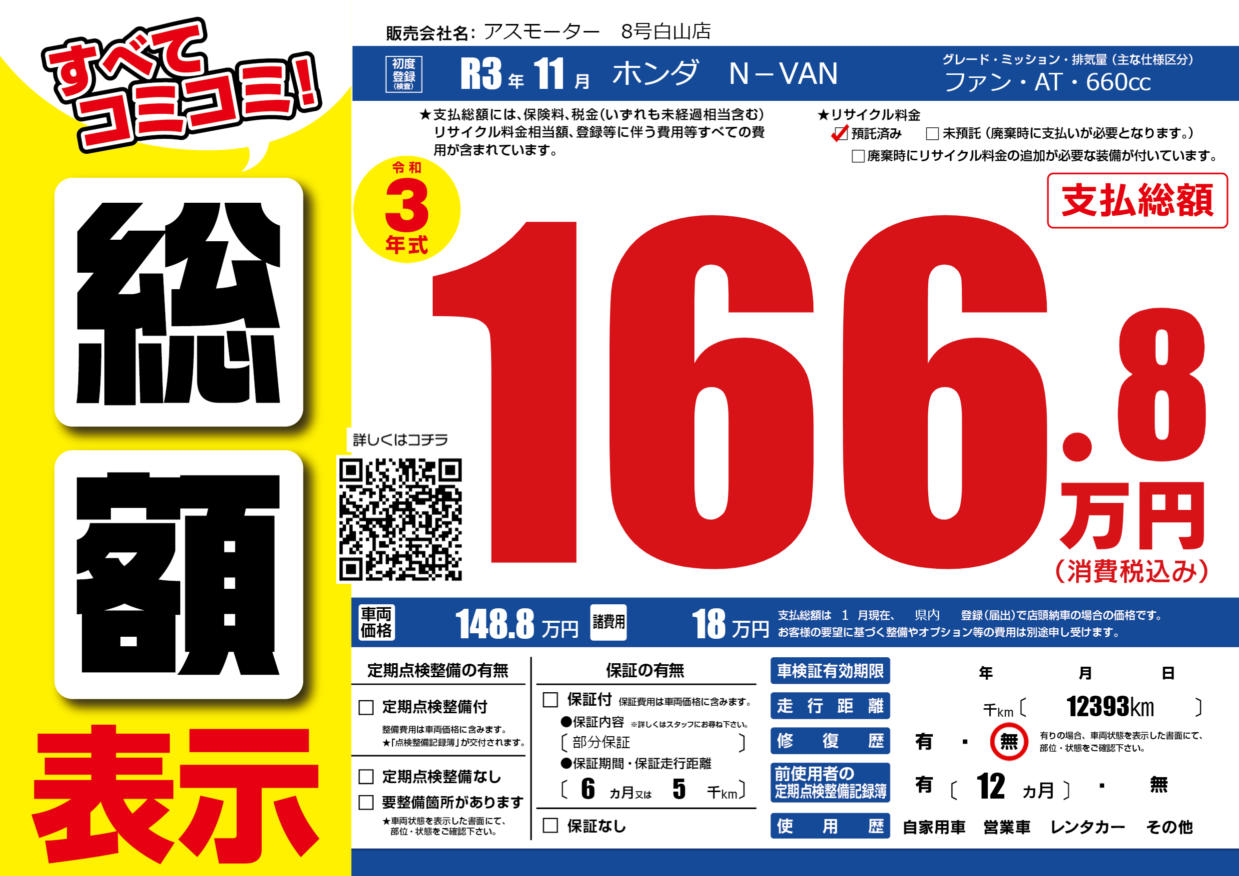 | 車名 | ホンダ N-VAN | グレード ミッション 排気量 |