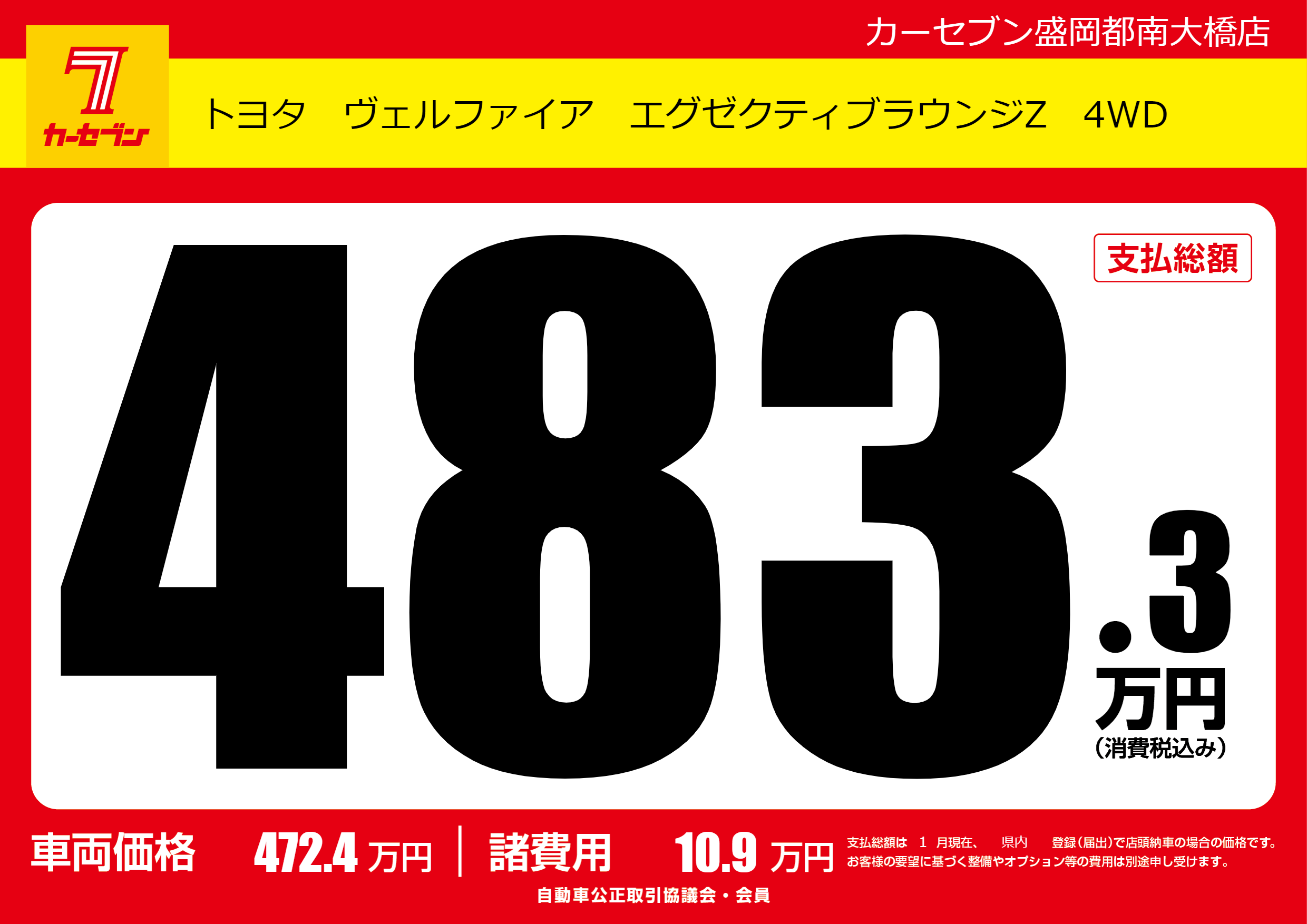 | 車名 | トヨタ ヴェルファイア エグゼクティブラウンジZ 4WD | グレード ミッション 排気量 |
